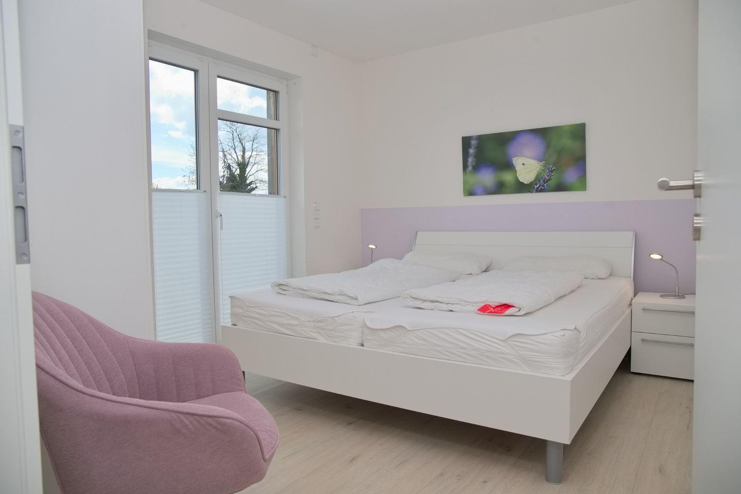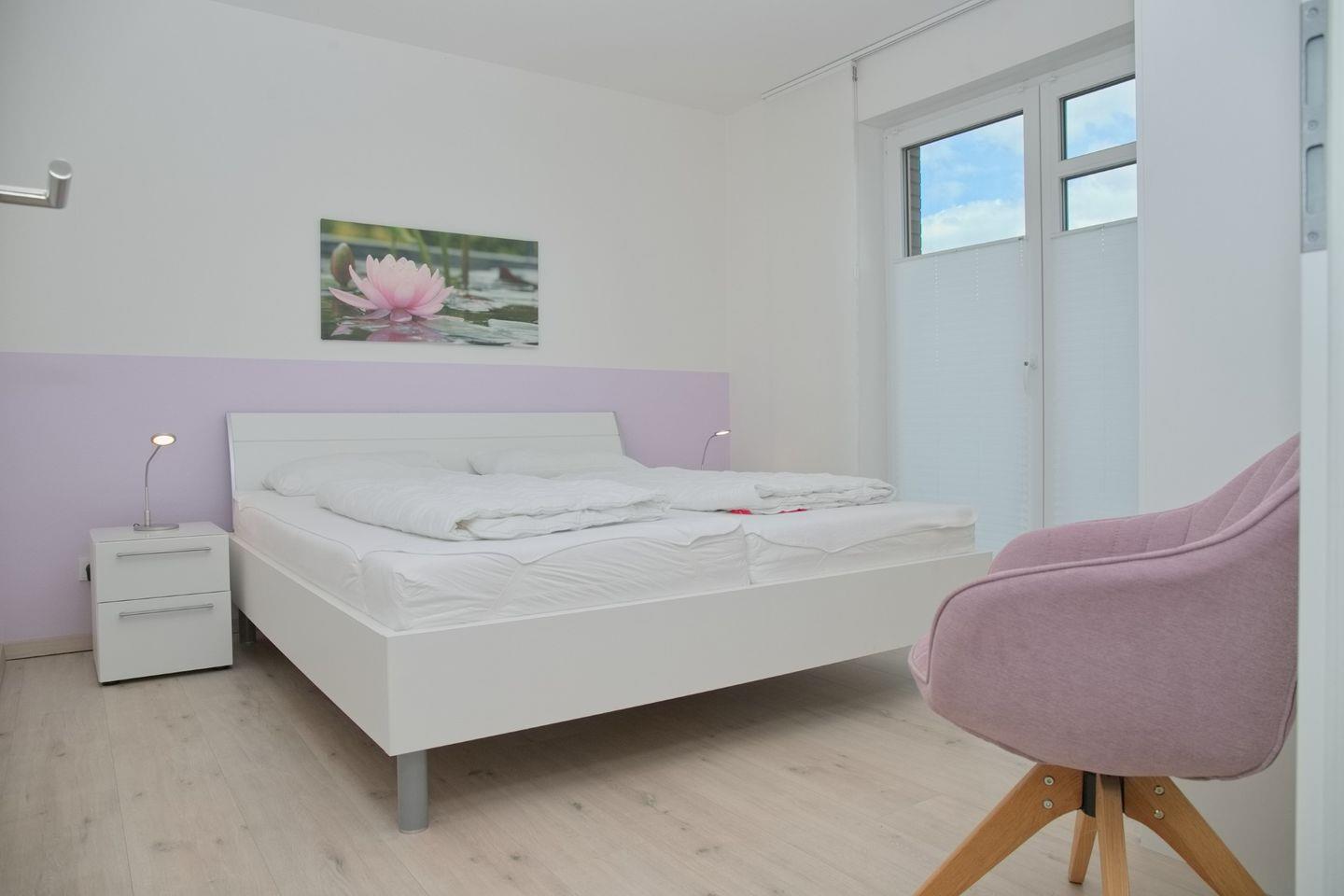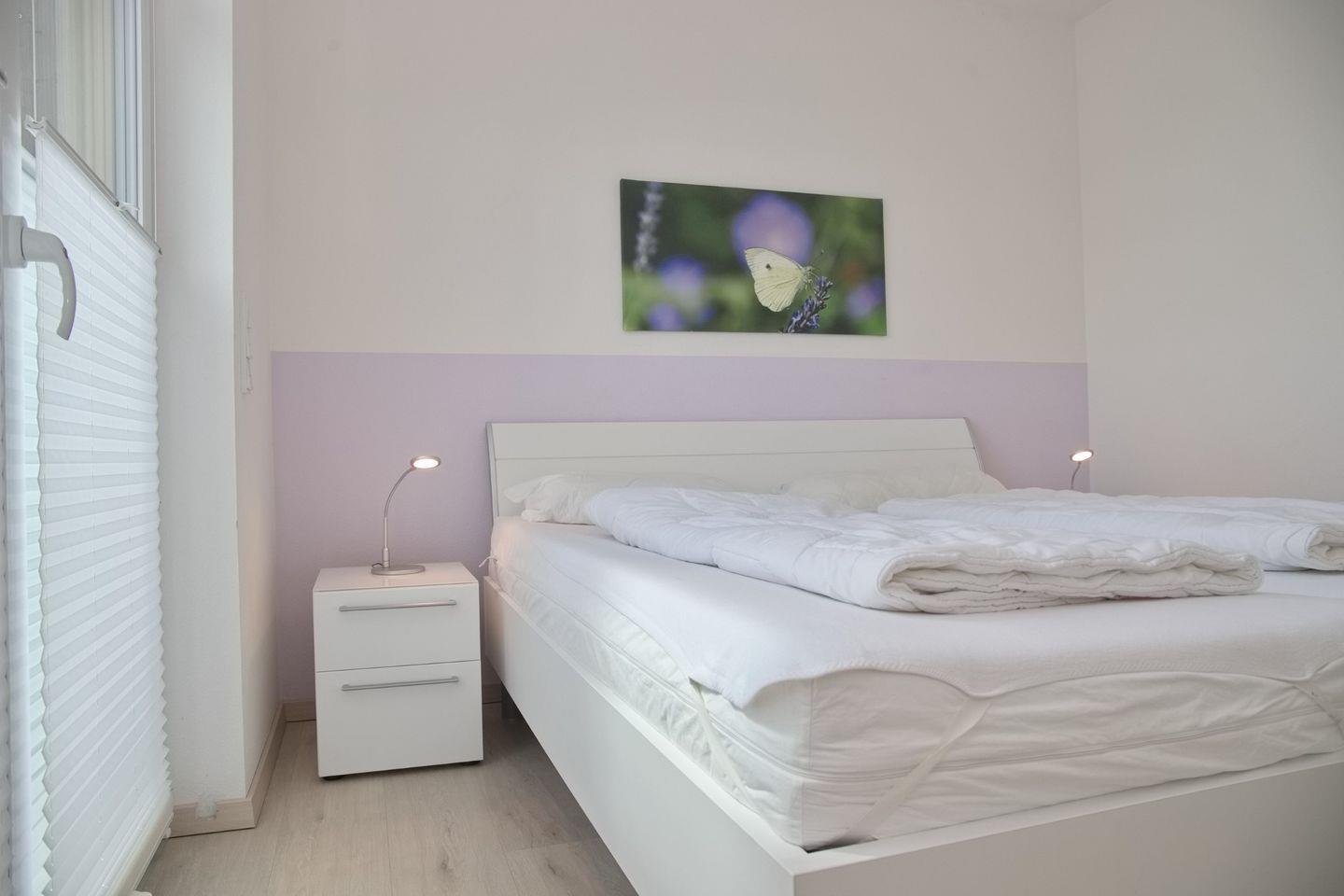 Außerdem befindet sich im Erdgeschoss ein Schlafzimmer mit einem komfortablen Doppelbett, einem Kleiderschrank und einem kleinen Sessel. Das moderne Bad ist durch ein bodentiefes Fenster lichtdurchflutet. Es verfügt über eine bodengleiche Dusche, ein WC, ein Waschbecken und einen praktischen Waschtrockner. Wäscheständer vorhanden.
