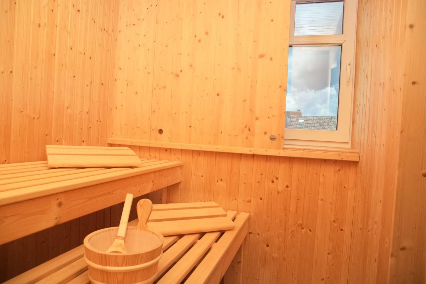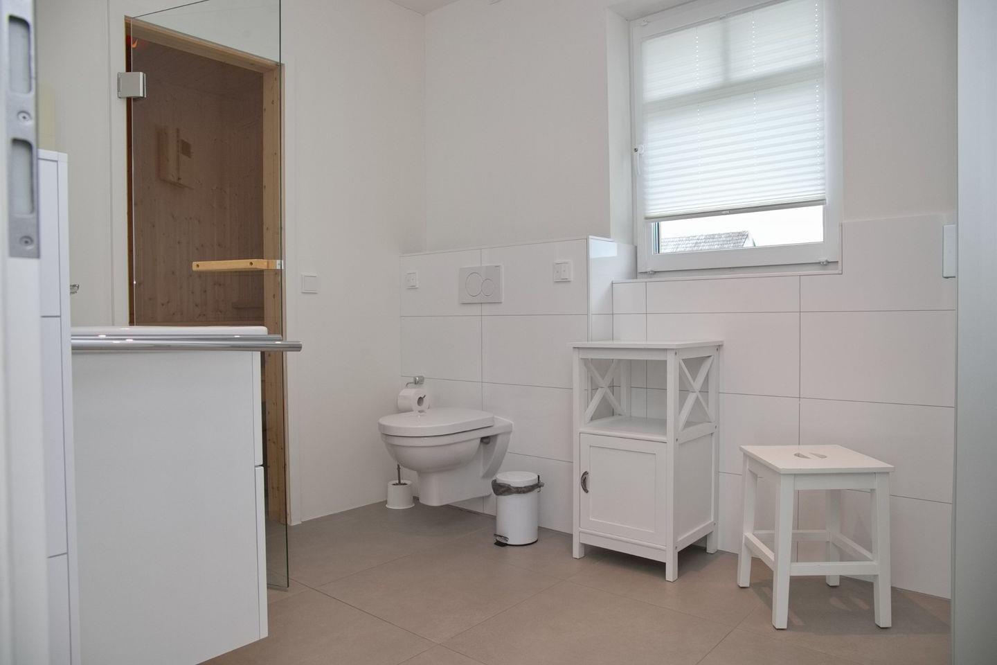 Das großzügige Bad im Obergeschoss ist ebenfalls modern gestaltet und verfügt über eine große bodengleiche Dusche, ein Waschbecken, ein WC sowie eine Sauna – ideal, um nach einem langen Strandtag zu entspannen.