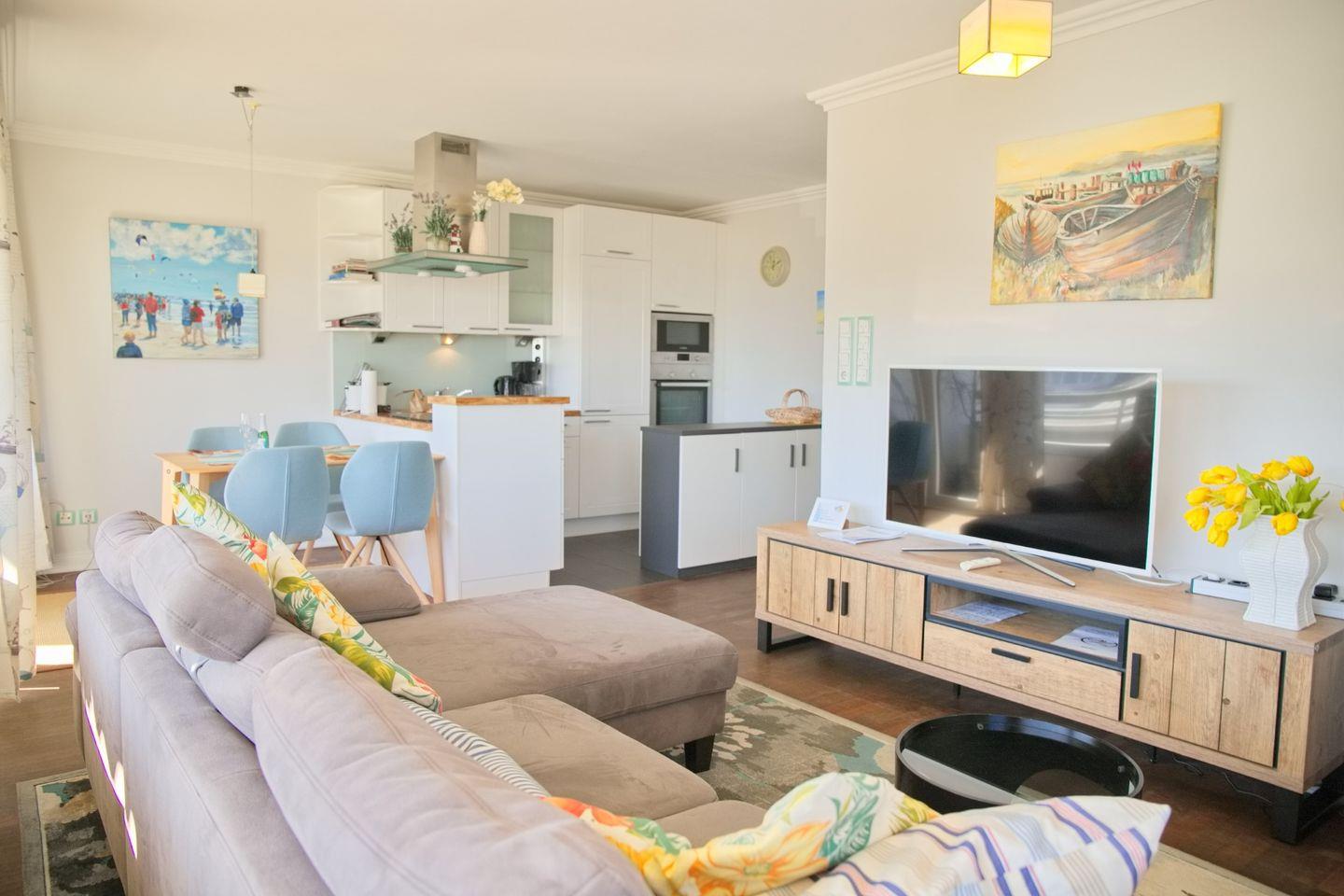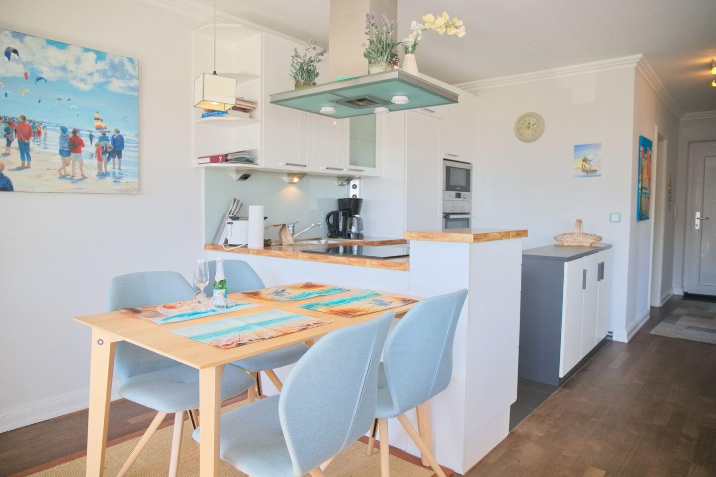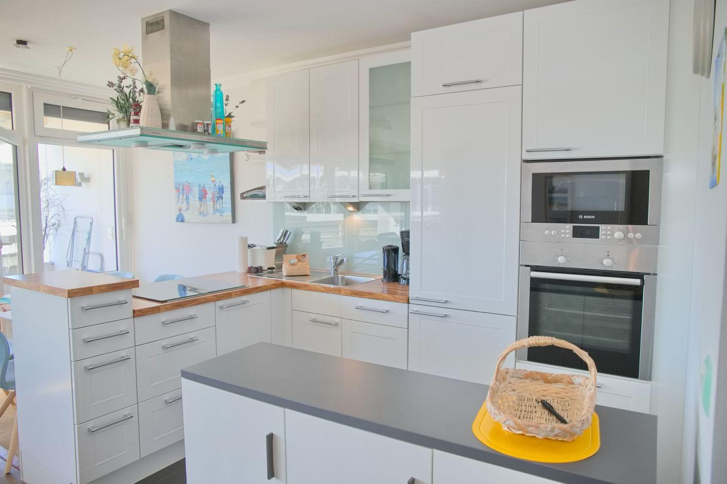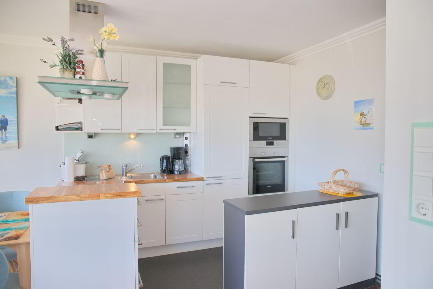 Die offen gestaltete Küche, die zum Wohnzimmer hin ausgerichtet ist, sorgt für eine gesellige Atmosphäre. Sie ist voll ausgestattet mit modernen Annehmlichkeiten, wie einem Cerankochfeld, einem Backofen, einer Spülmaschine und einer Mikrowelle. Hier können Sie Ihre Lieblingsgerichte zubereiten und gemeinsam am Esstisch im Essbereich genießen. Die Küchenausstattung umfasst zudem Kühlschrank mit Gefrierfach, Kaffeemaschine, Wasserkocher, Toaster und alle notwendigen Küchenutensilien.