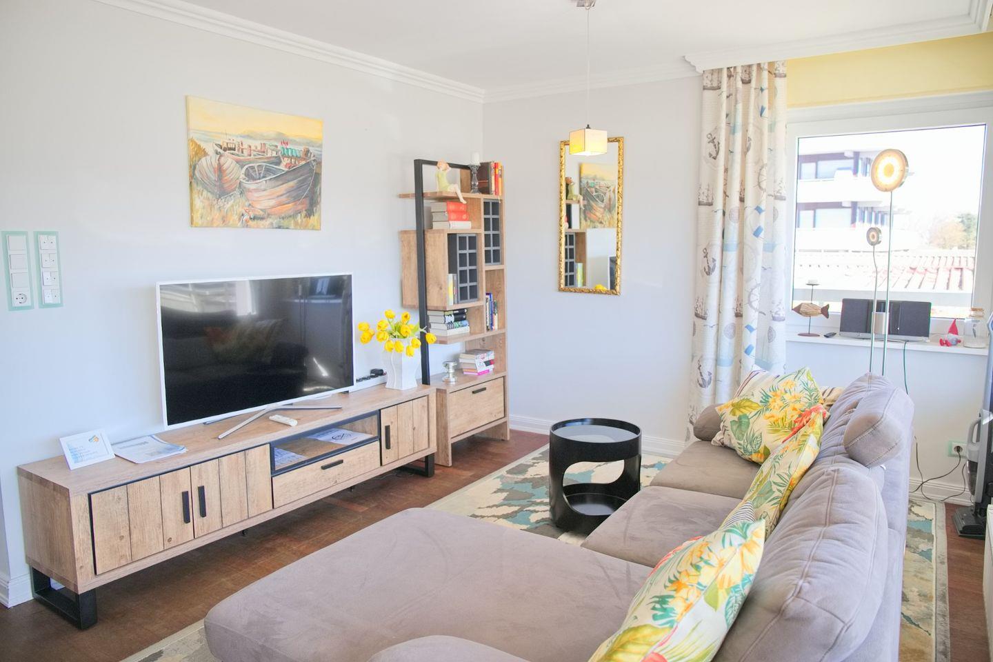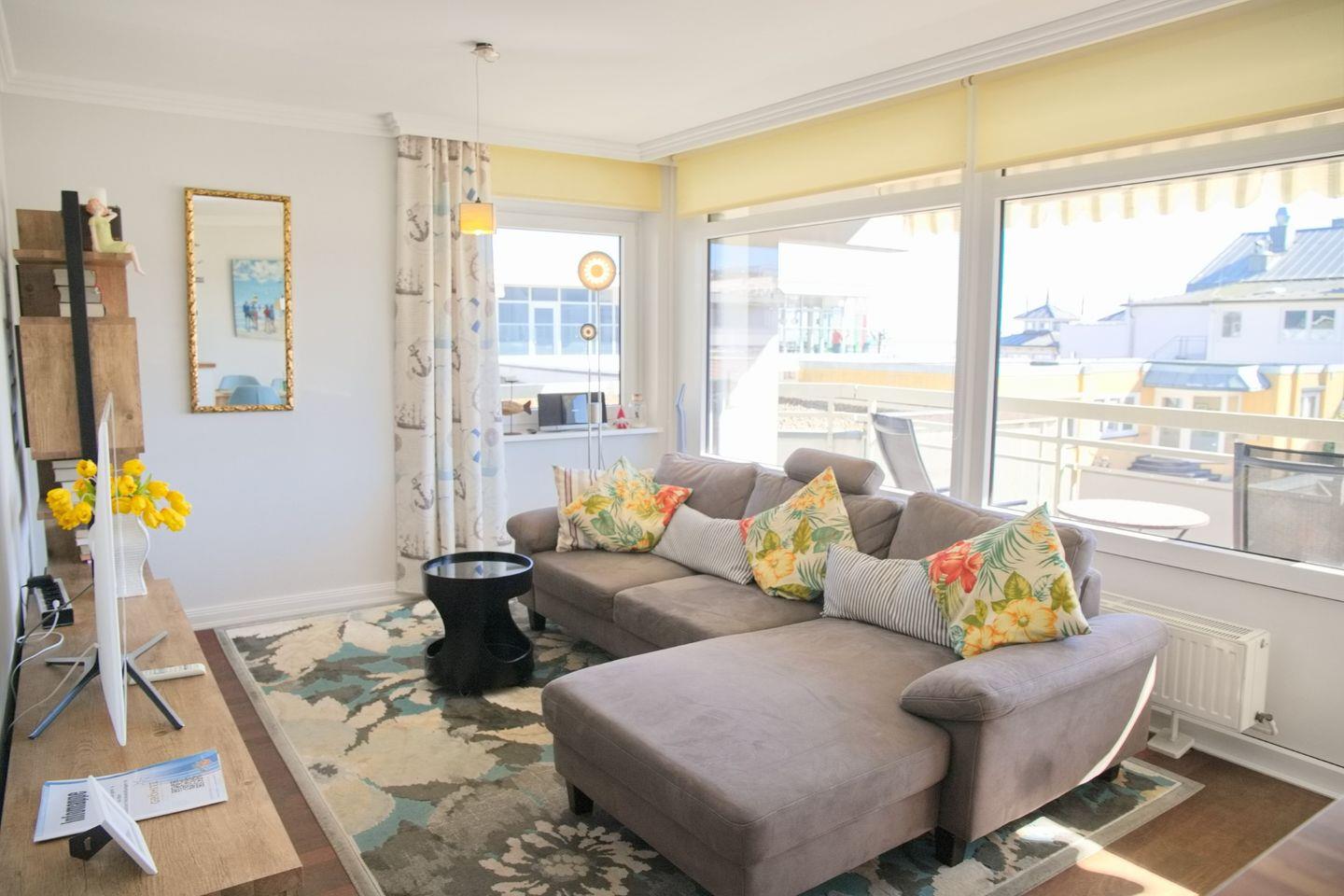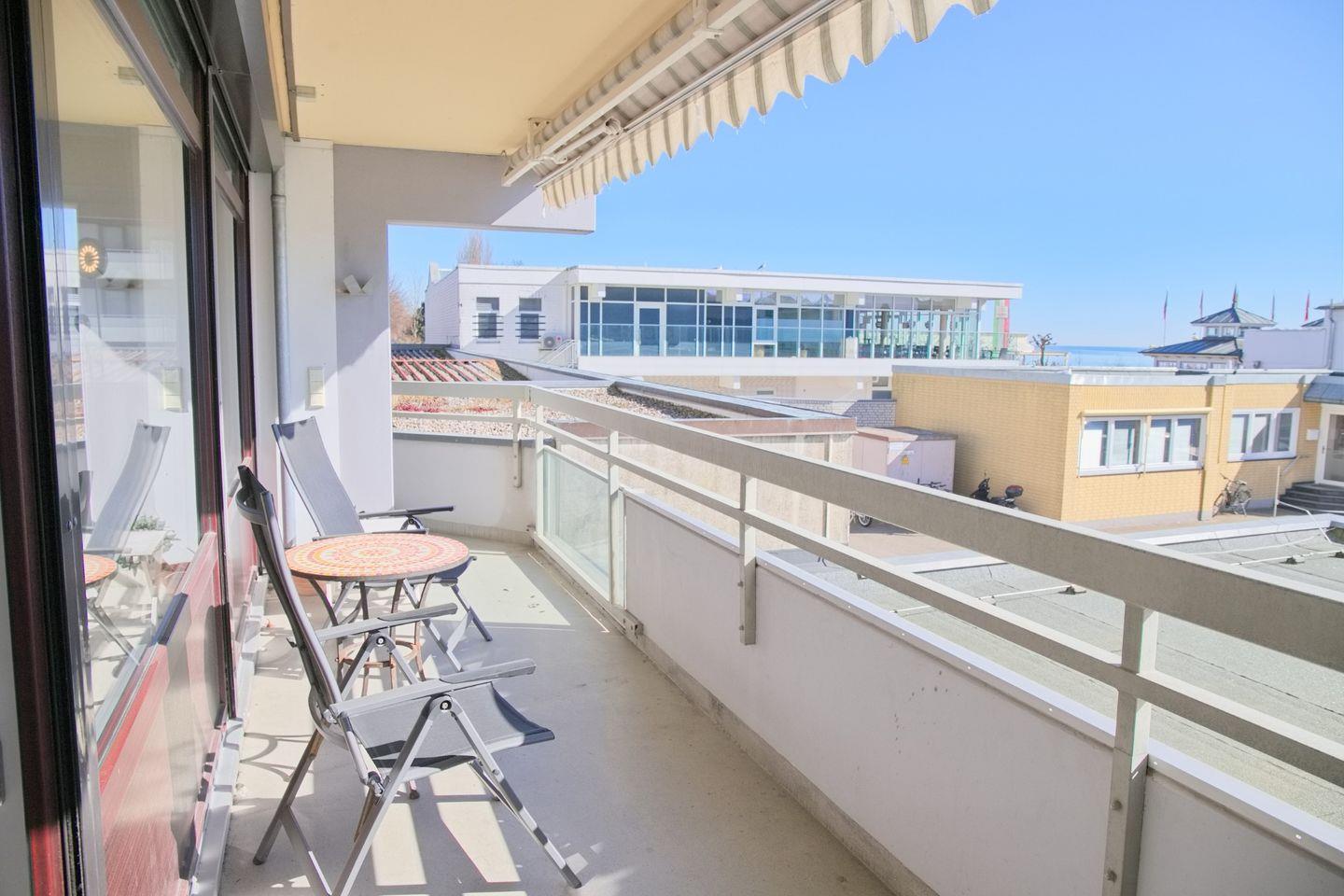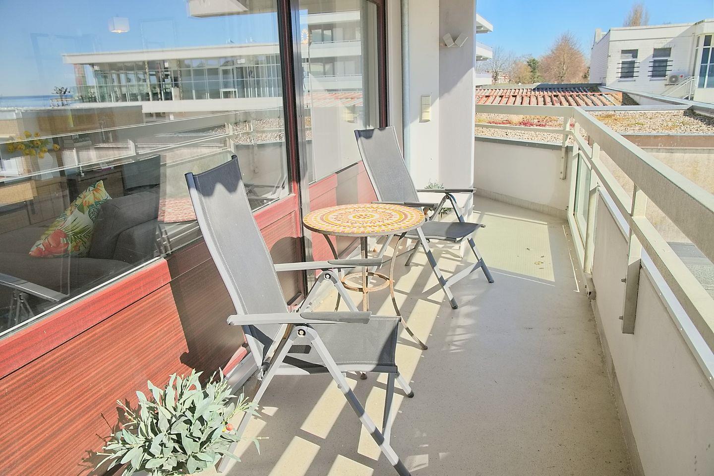 Stilvoll eingerichtete Ferienwohnung in Zentraler Lage mit einem möblierten Südbalkon und einem Teilseeblick über die Dächer der Strandhalle.