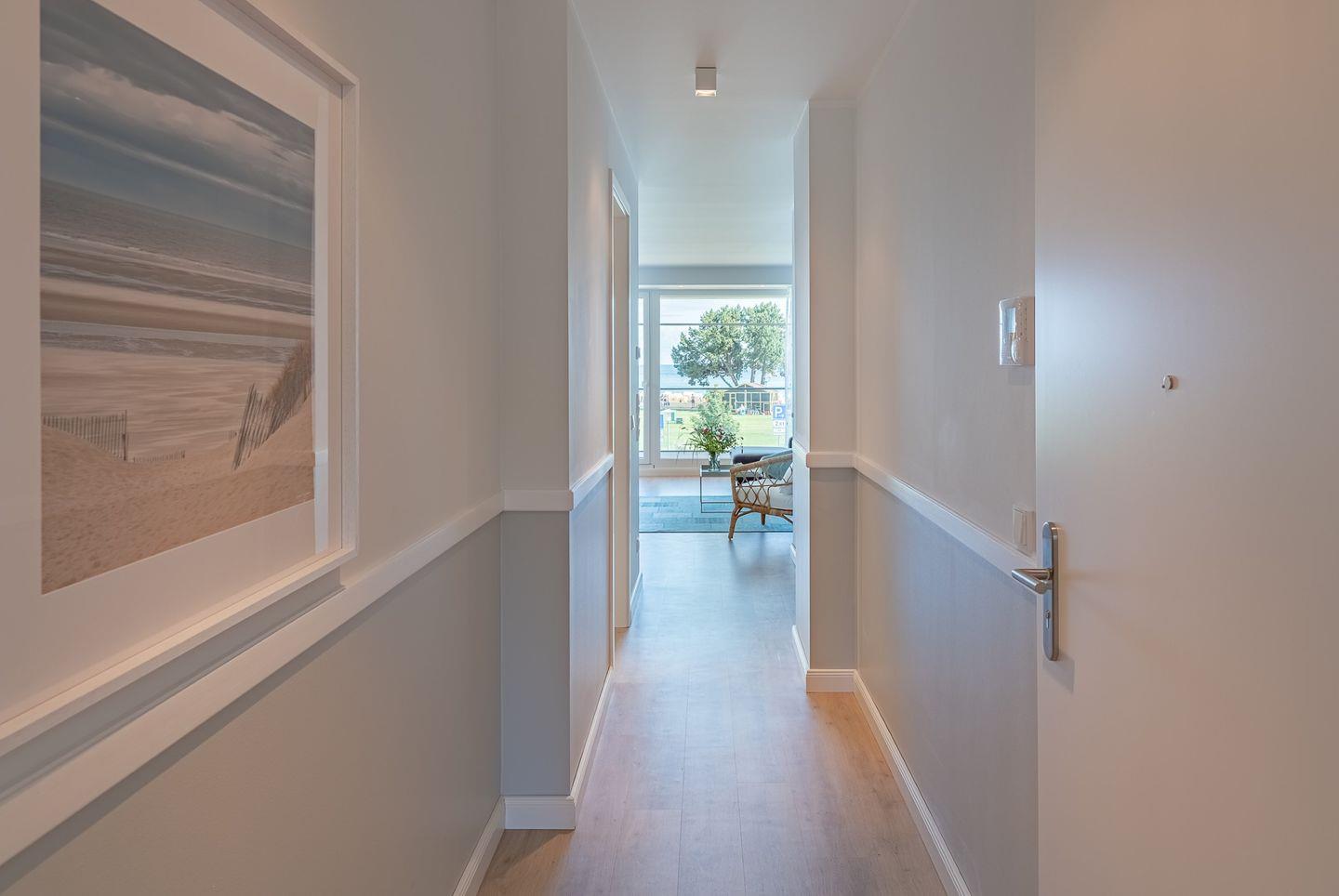 Das Bad begeistert mit Doppelwaschtisch, bodengleicher, großzügiger Regendusche, Handtuchheizung und beleuchtetem Schminkspiegel. Hier befindet sich auch ein Waschtrockner. Das Gäste WC mit großem Waschbecken komplettiert die Wohnung. Auf dem charmant angelegten Balkon mit Südausrichtung und direktem Meerblick lässt es sich wunderbar mit einem leckeren Kaffee in den Tag starten. Lassen Sie sich von der unvergleichlichen Panoramaaussicht über die Ostsee verzaubern und schnuppern die frische Seeluft. Der feine Sandstrand von Grömitz beginnt unmittelbar vor der Haustür, nur getrennt durch die schöne Promenade.