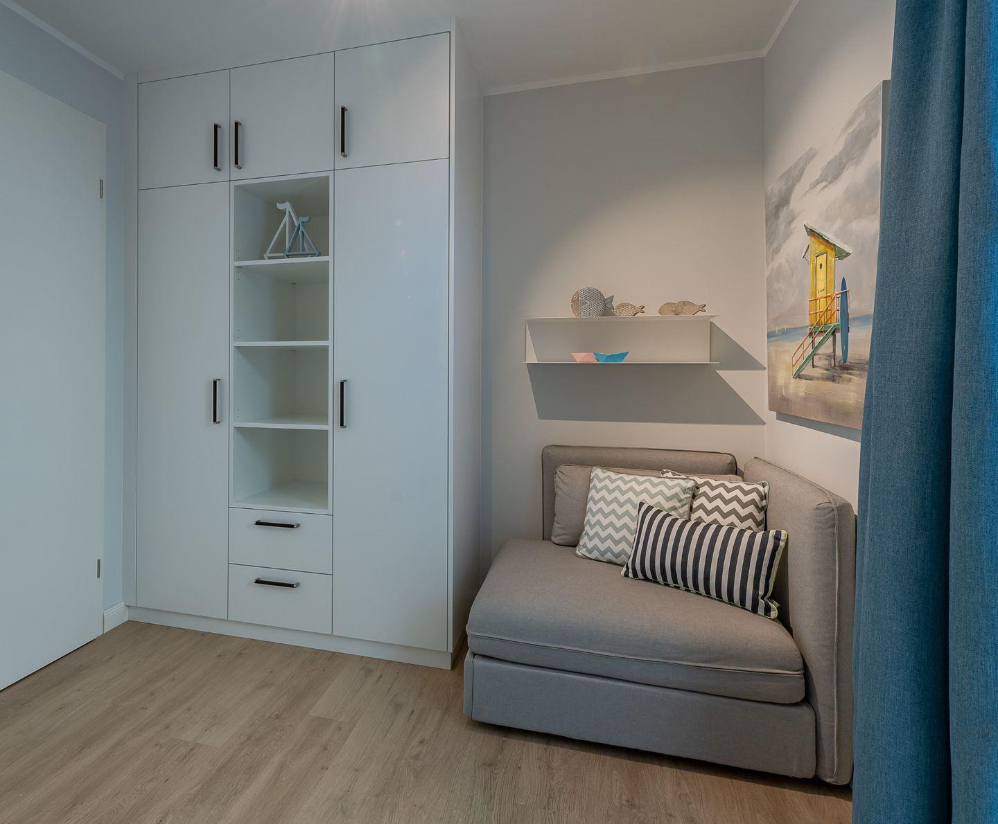 Der angrenzende Essplatz ist für bis zu 5 Personen ausgerichtet. Entspannen Sie sorglos nach Ihrem Strandtag in einem der beiden separaten Schlafzimmer mit komfortablen Boxspring-Betten (Masterschlafzimmer: 220x200 cm, Kinderzimmer: 160x200 cm) und LED Smart TVs. Das Masterschlafzimmer hat einen zusätzlichen Balkon mit Lounge zur Entspannung sowie einen begehbaren Kleiderschrank. Hier befindet sich auch ein Schreibtisch mit LAN Anschluss. Im Nebenschlafzimmer befindet sich zusätzlich ein Schlafsessel für die fünfte Person.