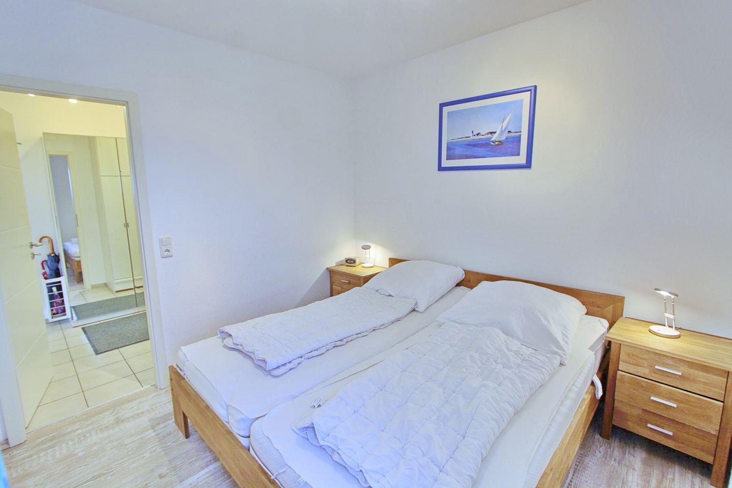 Gleich links befindet sich das Schlafzimmer mit Doppelbett (2 x 90 x 200 cm) und Fenster mit Seeblick und Außenrollläden. Weiter geht es in das zweite Schlafzimmer mit Einzelbetten (90 x 200 cm) und Nachtschränken. Ein Fenster mit Seeblick und Außenrollläden ist ebenfalls vorhanden. Bevor es in das Tageslicht Duschbad mit WC, Waschbecken und beleuchteten Spiegel geht, kommen Sie an der offenen Küchenzeile vorbei. Diese ist ausgestattet mit einem Cerankochfeld, Backofen, Mikrowelle, Kühlschrank mit Gefrierfach, Geschirrspülmaschine und weitere Küchenhelfer. Den Flur entlang befindet sich das Wohnzimmer. Eine gemütliche Eckcouchgarnitur mit zwei Sesseln lädt zum geselligen beisammen sein ein. Ein Radio und ein Flach TV stehen zur Unterhaltung bereit. Der Essbereich bietet ausreichend Platz.