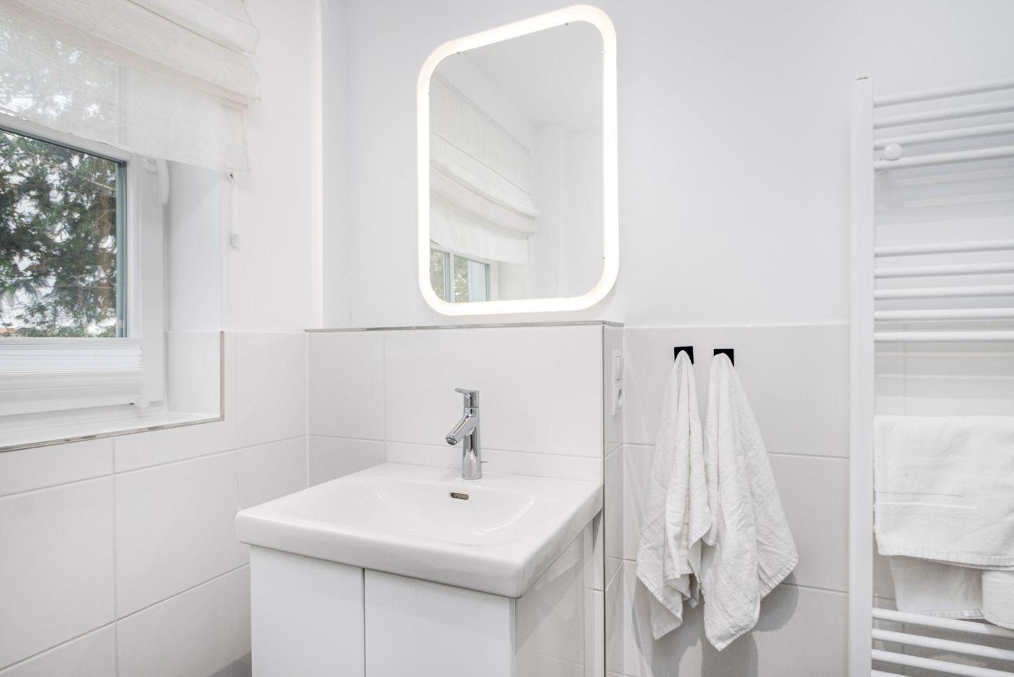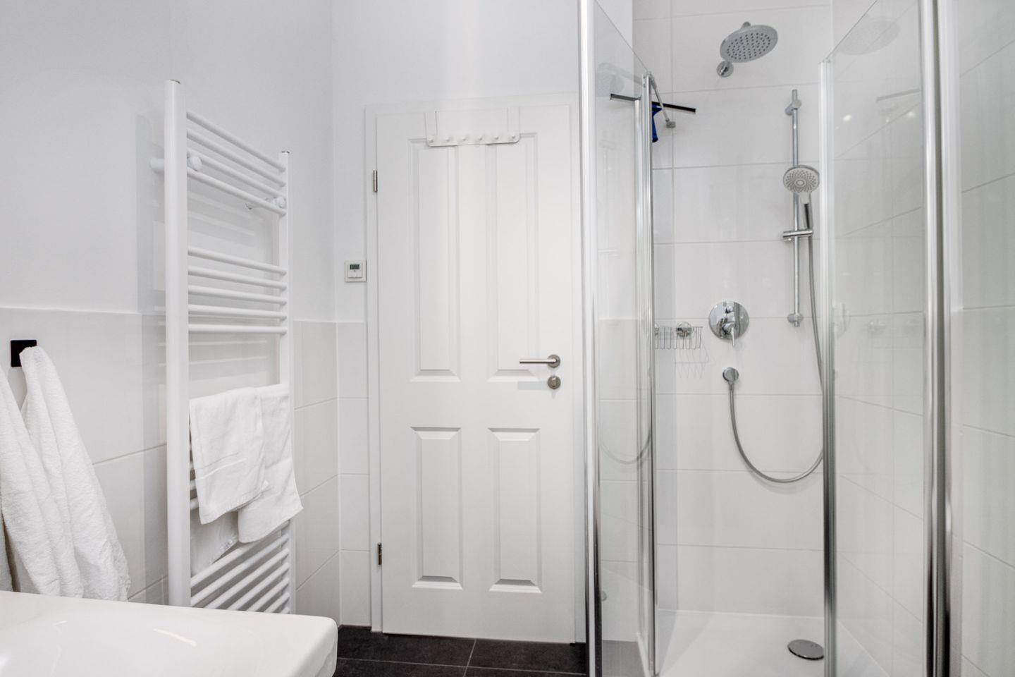 Im Badezimmer finden Sie eine großzügige Echtglas-Duschkabine mit Rainshower-Funktion, ein WC, einen Waschtisch, einen beleuchteten Spiegel und ein Fenster für angenehme Lichtverhältnisse.