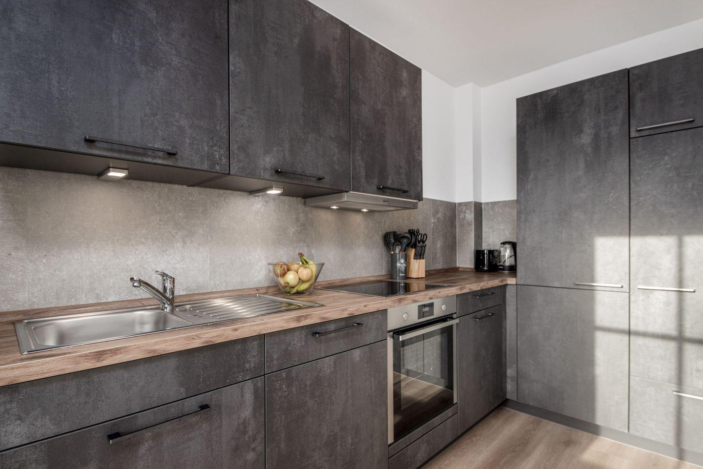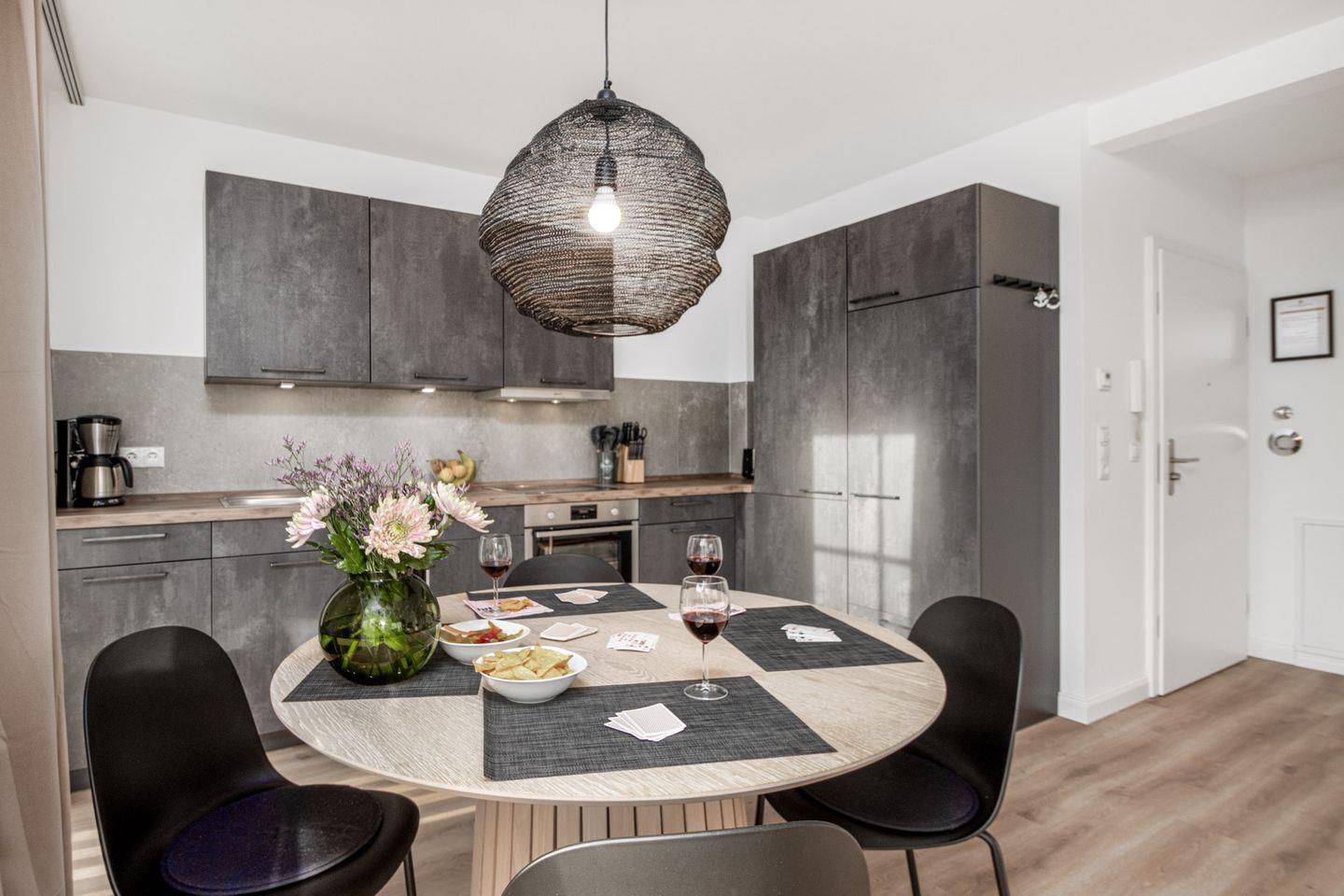 Die offene Küche ist komplett ausgestattet mit modernen Geräten wie Induktionskochfeld, Backofen, Spülmaschine, Kühlschrank mit Gefrierfach, Wasserkocher, Toaster und Kaffeemaschine.