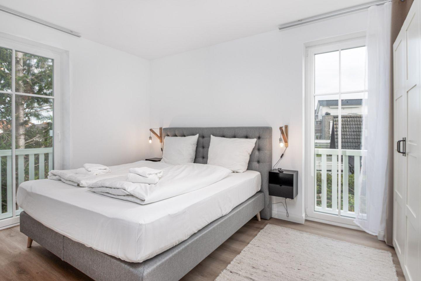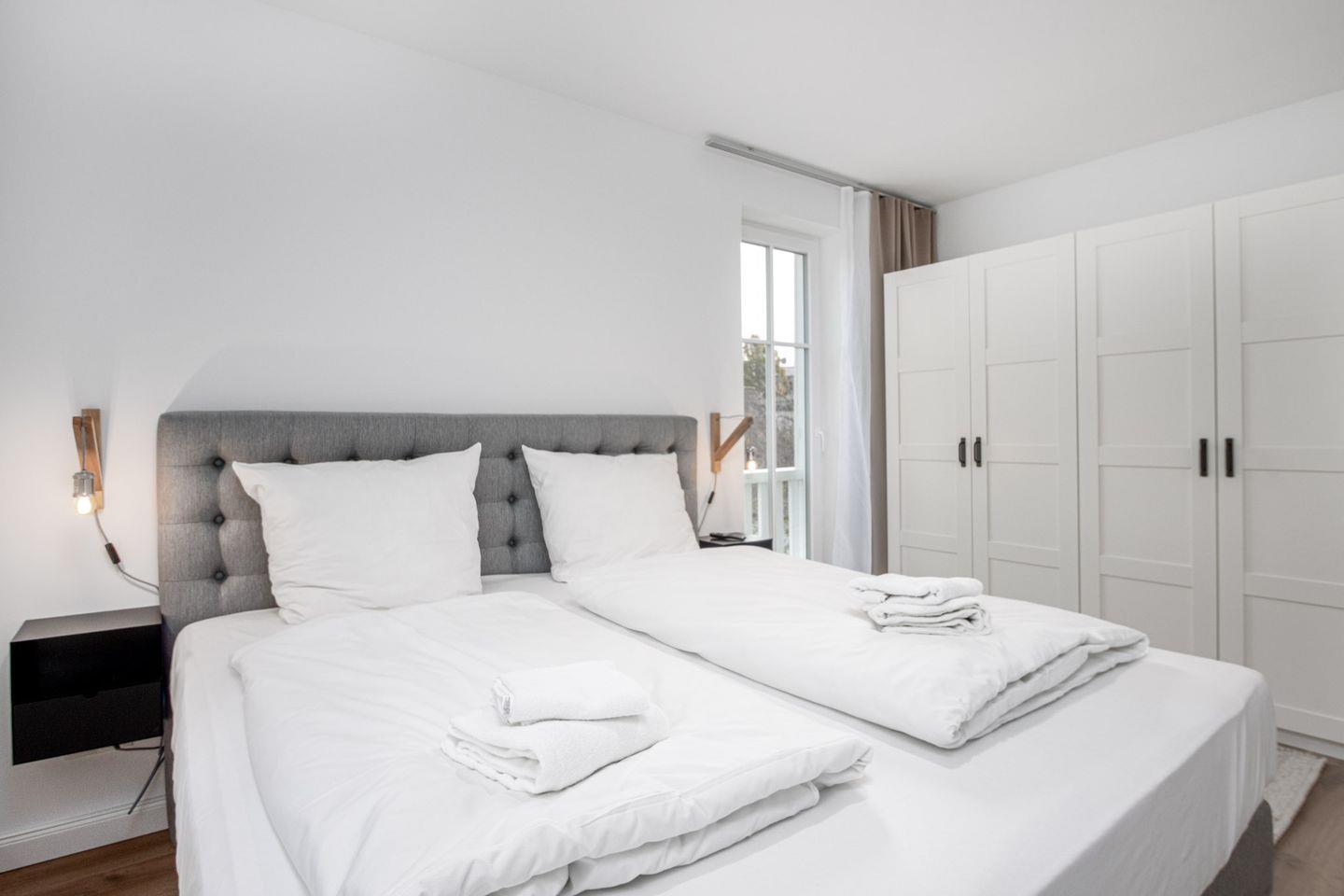 Das Schlafzimmer erwartet Sie mit einem luxuriösen Boxspringbett (180x200 cm Liegefläche), einem geräumigen Kleiderschrank, einem Smart-TV und Verdunkelungsgardinen für einen erholsamen Schlaf.