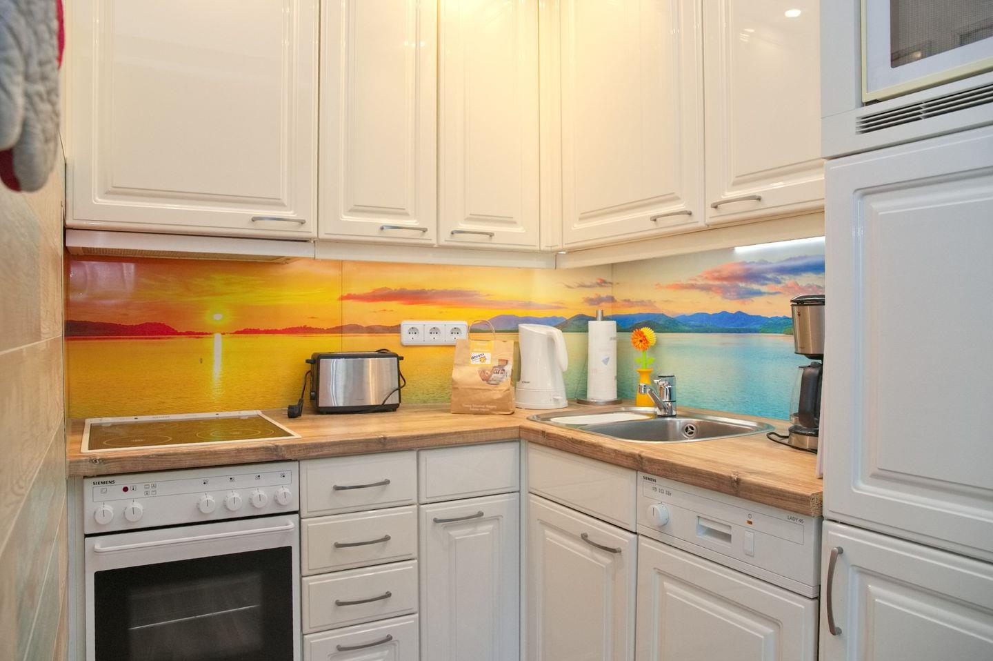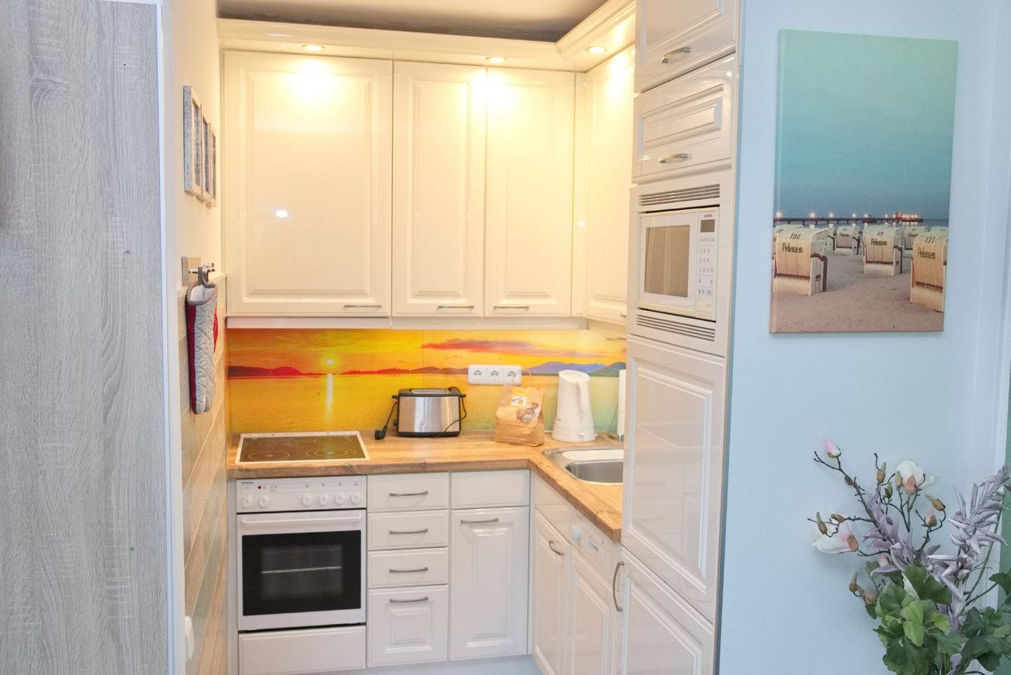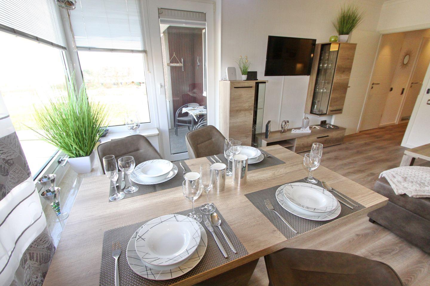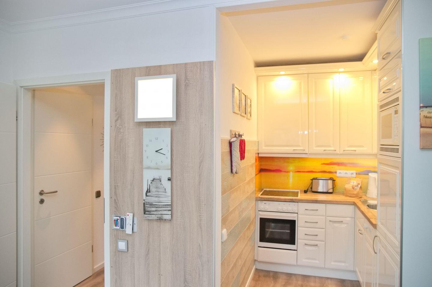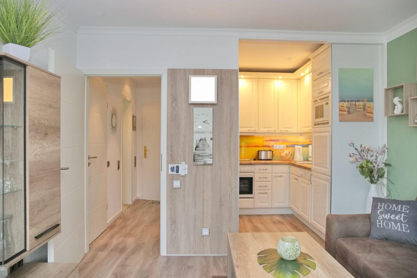 In der Wohnung angekommen erwartet Sie ein schmaler Flur mit Garderobe und Einbauschrank. Zu Ihrer rechten befindet sich das Duschbad mit WC, Waschtisch und beleuchteten Spiegel. Weiter kommen Sie in das separate Schlafzimmer. Hier erwartet Sie ein bequemes Doppelbett (2x90x200 cm), Nachttische und ein großer Kleiderschrank. Zurück auf den Flur geht es gerade aus weiter in den kombinierten Wohn- und Kochbereich. Der stylische Essbereich mit vier Stühlen hat seinen Platz vor der Fensterfront bekommen. Hier können Sie schon beim Frühstück den Blick Richtung Meer genießen. Die Eckschlafcouch lädt zum geselligen Beisammen sein ein. Ein Flachbild TV und eine Stereoanlage mit CD Player stehen zur Unterhaltung bereit. Die angrenzende offen gestaltete Einbauküche verfügt unter anderem über ein Cerankochfeld, Backofen, Geschirrspülmaschine, Kühlschrank mit Gefrierfach und weitere kleine nützliche Küchenhelfer.