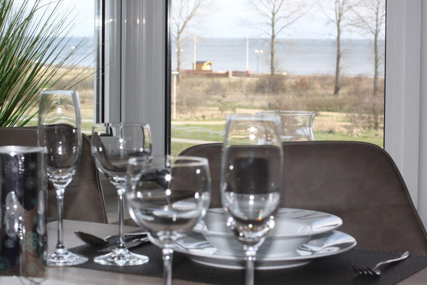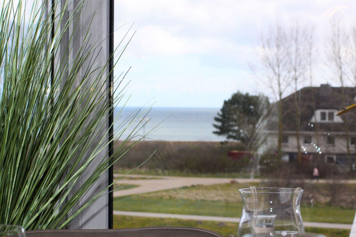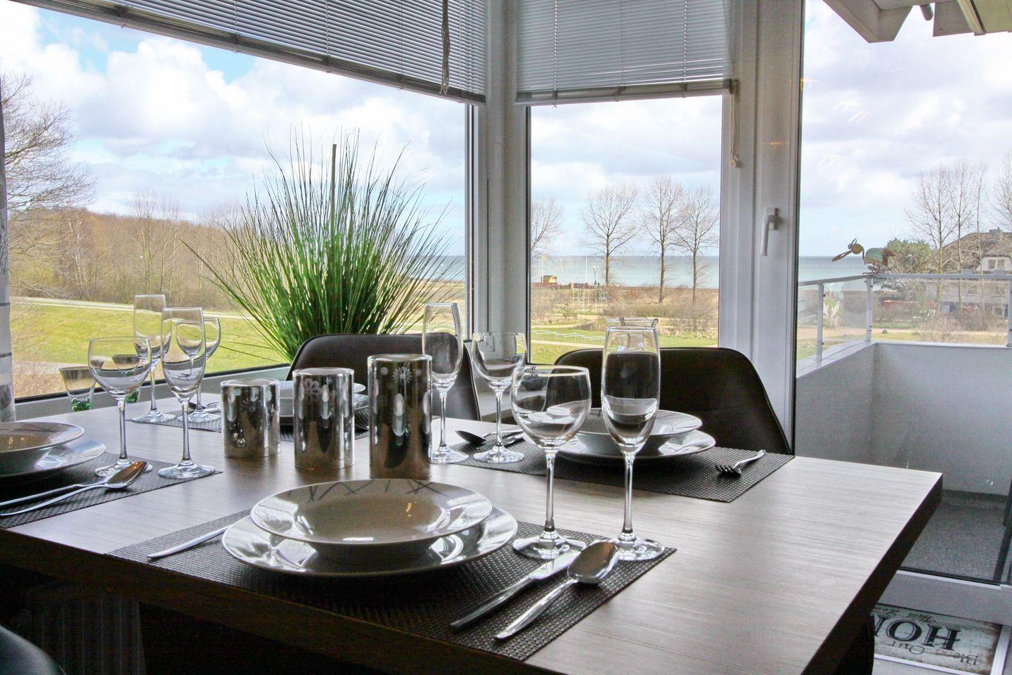 Modisches und extravagantes Ferienappartement in erster Reihe, direkt hinter dem Deich, mit möblierten Ostbalkon und Blick auf die Ostsee.