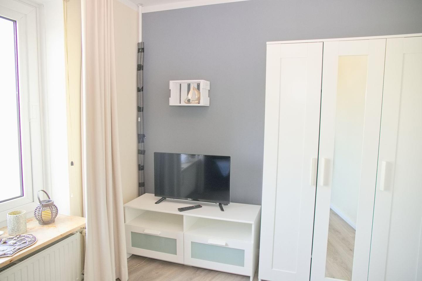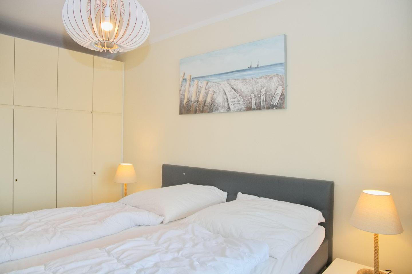 Das Schlafzimmer verfügt über ein komfortables Boxspringbett (180x200 cm) mit durchgehendem Topper, einen Kleiderschrank und einen Flachbild-TV für entspannte Abende.