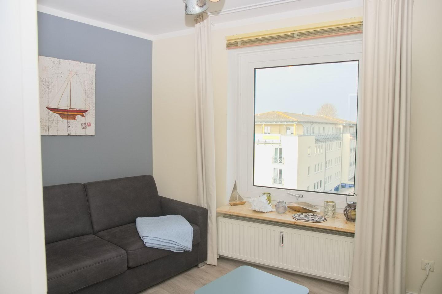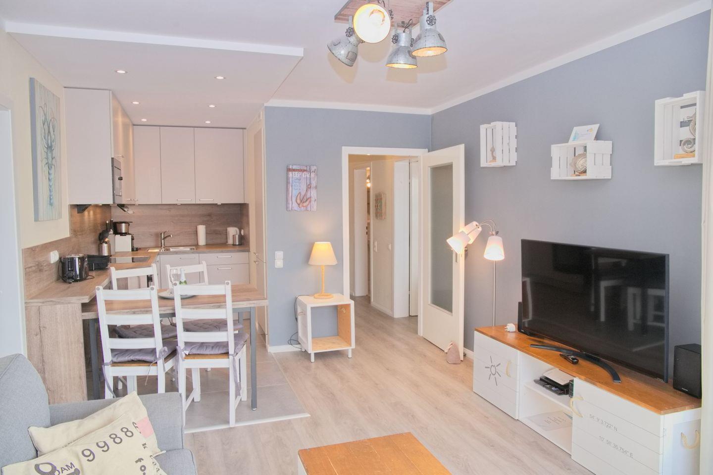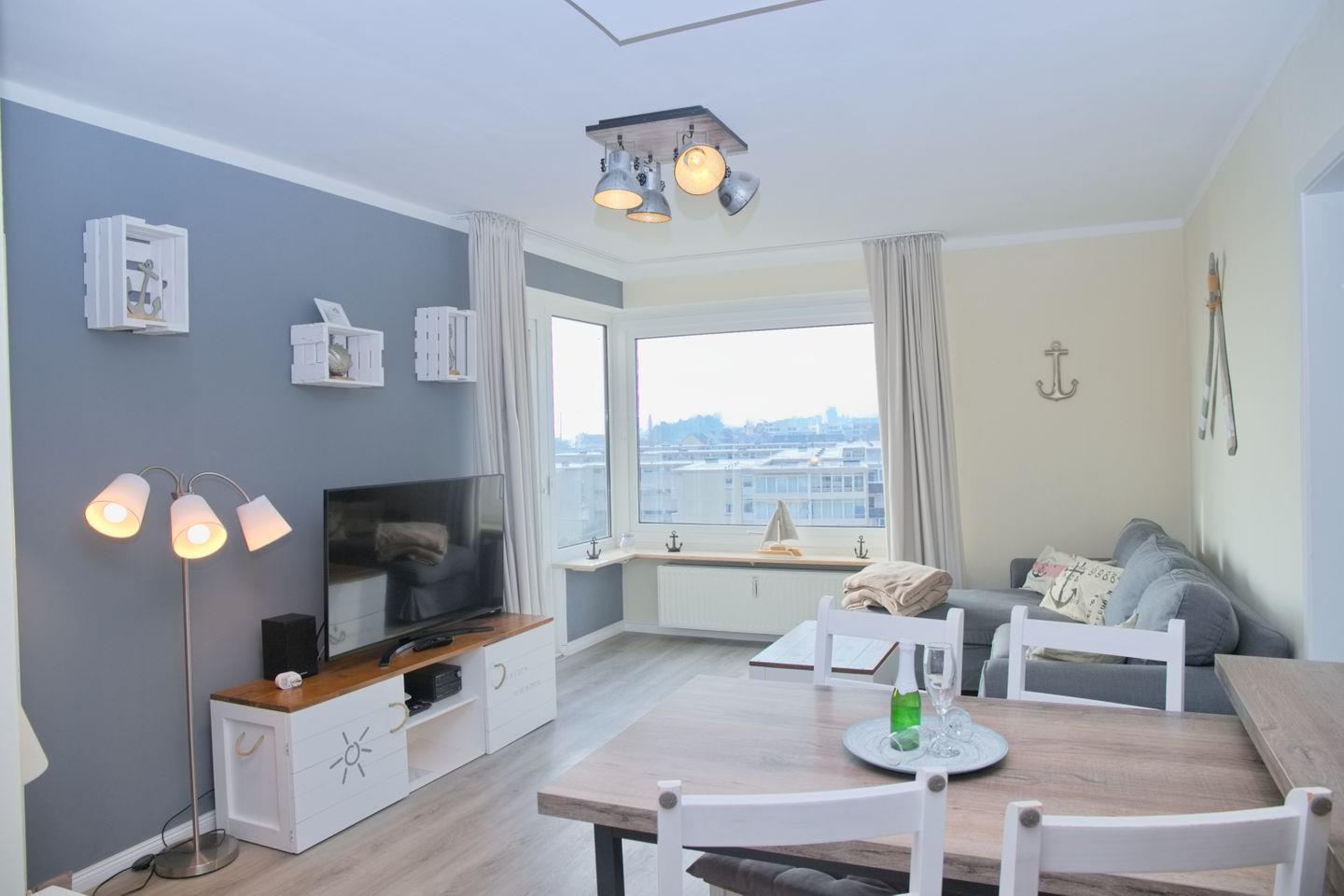 Das Wohnzimmer ist gemütlich eingerichtet mit einer Couch, einer Essecke für 4 Personen, einem Flachbild-TV und einem Zugang zum Balkon, von dem aus Sie den Blick auf die Ostsee genießen können.