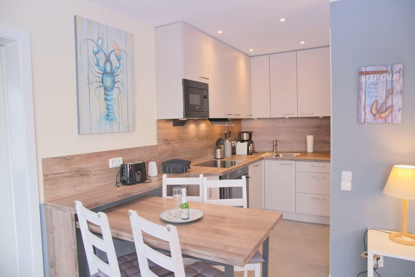 Die offene Küche ist voll ausgestattet mit einem Induktionskochfeld, einem Backofen, einem Kühlschrank mit Gefrierschrank, einem Toaster, einem Wasserkocher, einer Kaffeemaschine, einer Mikrowelle und einem kleinen Weinkühlschrank - perfekt für die Zubereitung Ihrer Lieblingsmahlzeiten.
