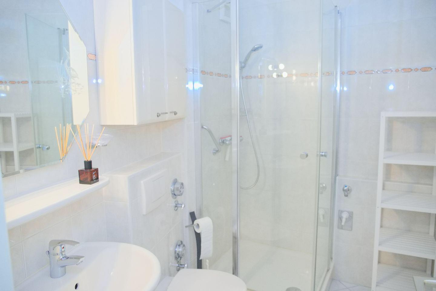 Das moderne Bad ist ausgestattet mit einer Dusche, einem WC und einem Spiegel für Ihre tägliche Pflege.