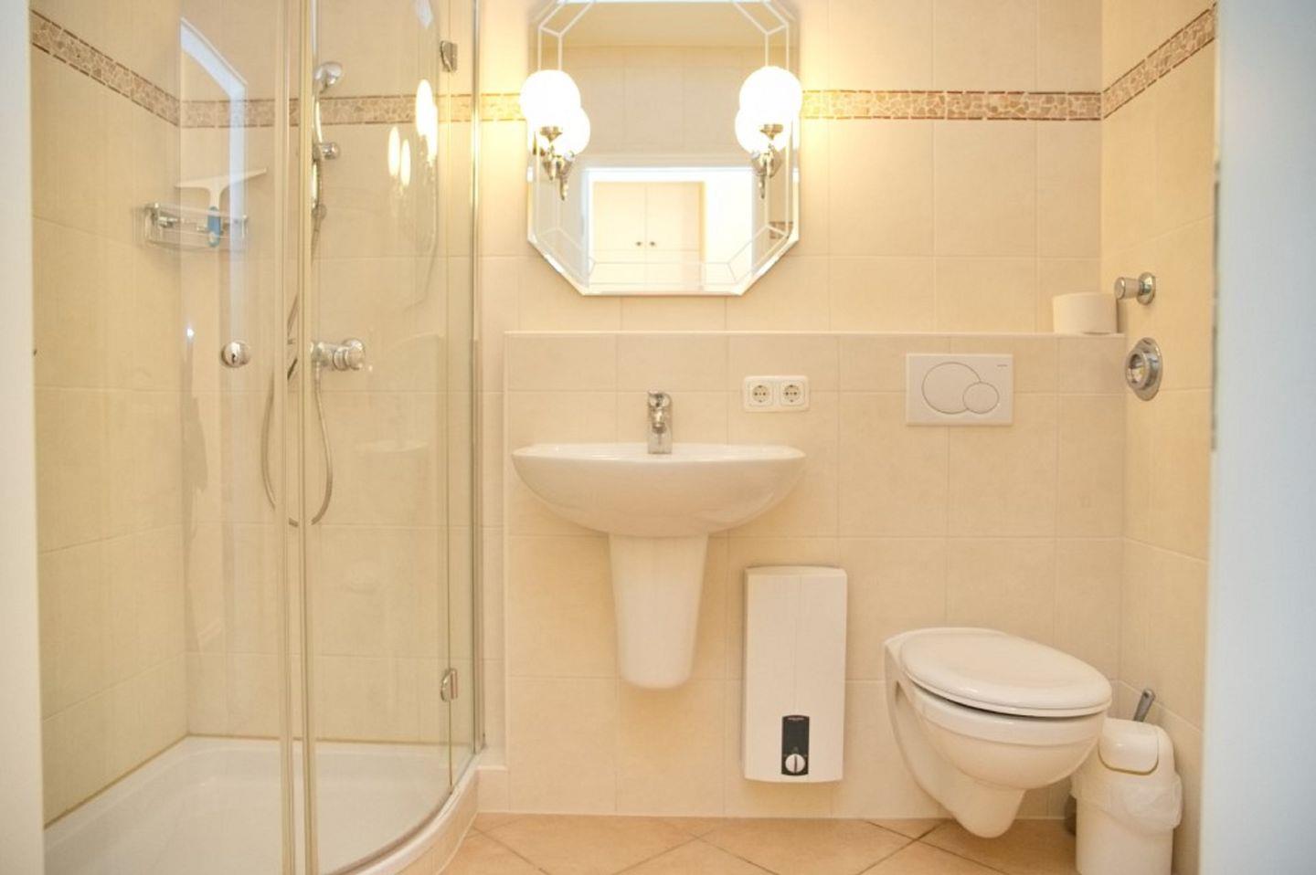 Das Badezimmer mit durchdachten Details ist mit Eckdusche, Waschtisch sowie einem WC ausgestattet.