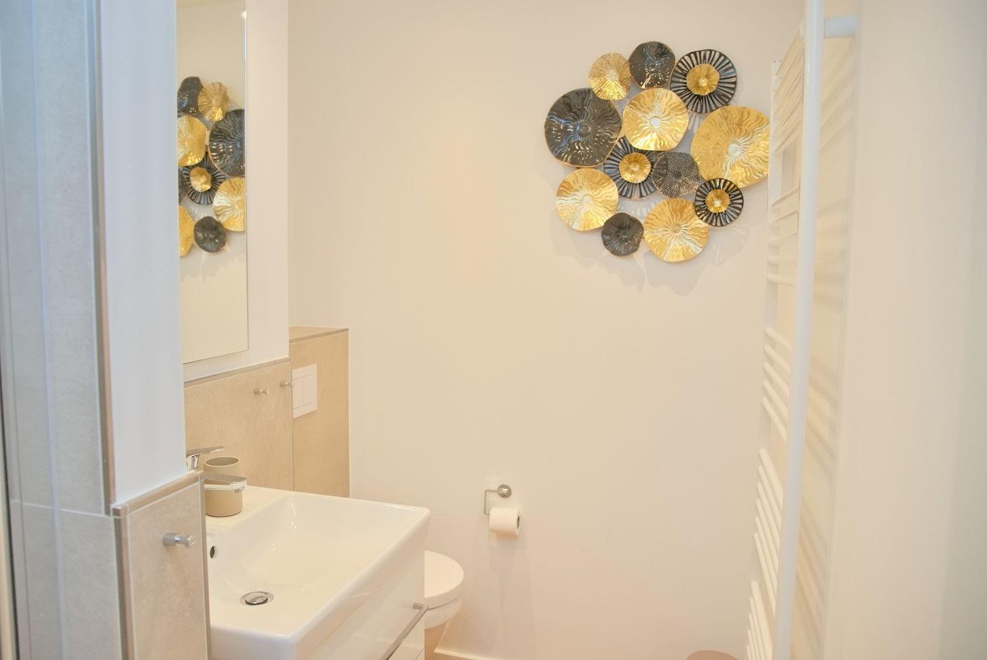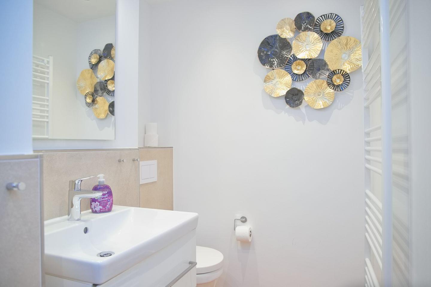Die Wohnung ist mit zwei Fernsehern ausgestattet, sodass Unterhaltung für alle garantierte ist. Die Schlafmöglichkeiten sind ebenfalls komfortabel gestaltet; das Schlafzimmer bietet ein modernes Boxspringbett (durchgehende Matratze 180x200 cm), das Wohnzimmer hält eine hochwertige Schlafcouch bereit, während das Badezimmer mit einer Dusche, einem WC und einem Waschbecken ausgestattet ist. Zudem stehen Ihnen eine Waschmaschine und ein Trockner zur gemeinschaftlichen Nutzung zur Verfügung, um Ihre Wäsche bequem im Urlaub zu waschen.