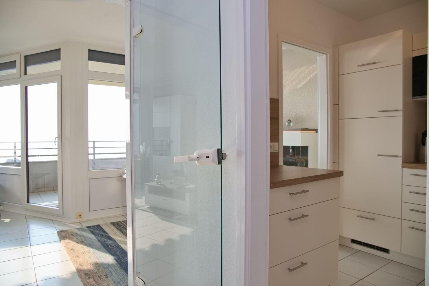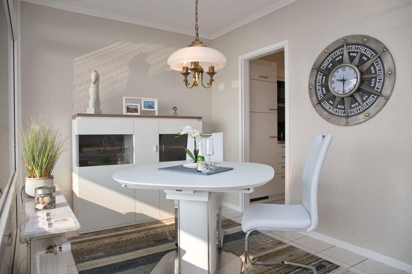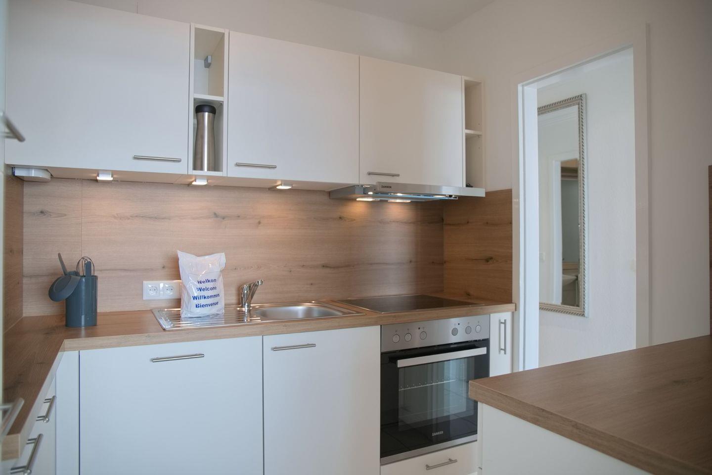 Der moderne Ess- und Wohnbereich ist dank der großen Fensterfronten hell und freundlich. Genießen Sie die Aussicht auf die Seebrücke auch an regnerischen Tagen. Die harmonisch integrierte Küche ist mit einem Kühlschrank mit Gefrierfach, einem 4-Zonen-Cerankochfeld, einem Backofen, einer Geschirrspülmaschine, einer Mikrowelle, Wasserkocher, Toaster und diversem Kleininventar ausgestattet.