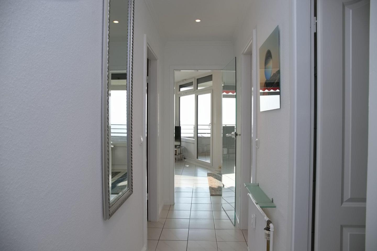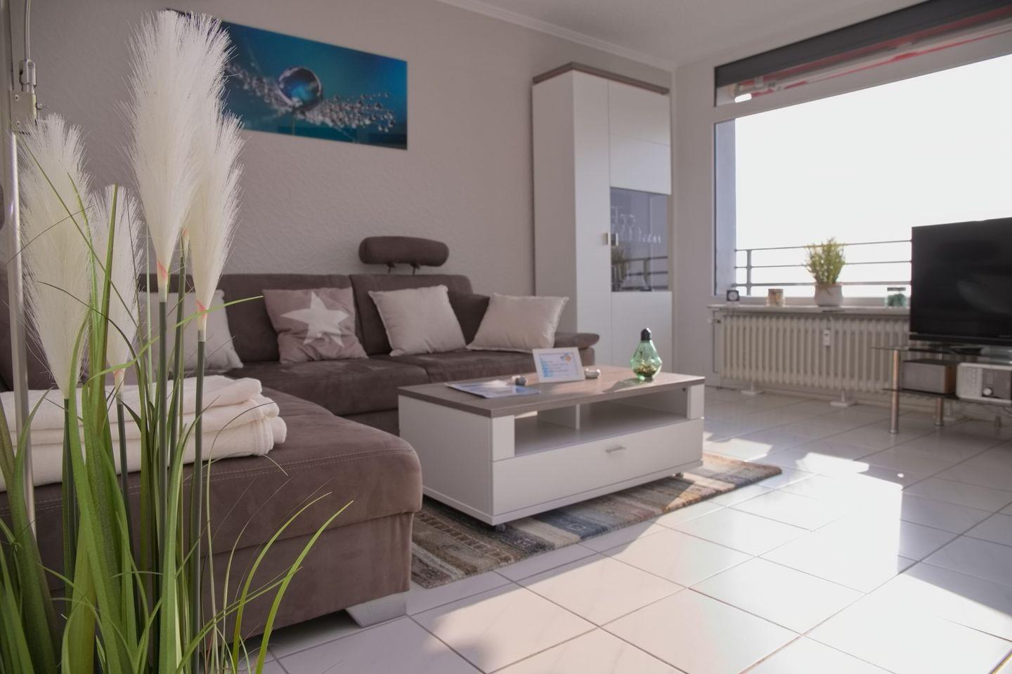 Der Wohnbereich ist mit einer bequemen Couch mit Schlaffunktion für 2 Personen sowie einem Flachbild-TV mit integriertem Radio und kostenlosem WLAN ausgestattet. Das besondere Highlight dieses Raumes sind die komplett verglasten Fensterfronten mit dem direkten Ostseeblick. Sehen Sie im Sommer dem Treiben auf der Promenade zu und lassen die Seele baumeln...