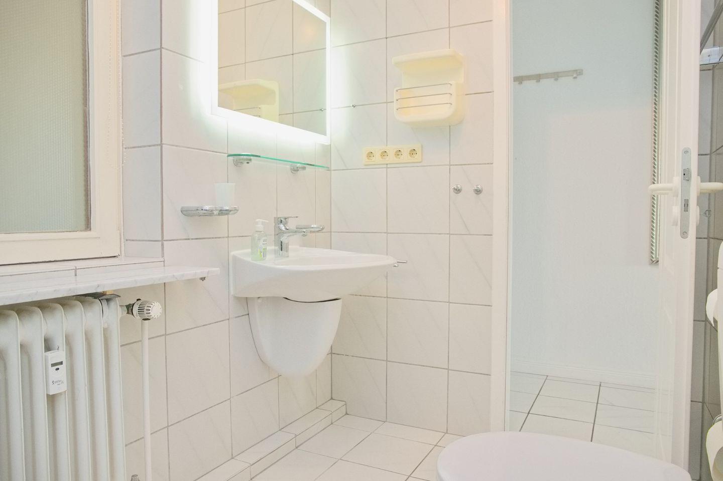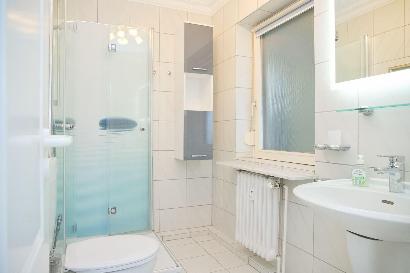 Ein Duschbad mit WC, beleuchteten Spiegel und Fenster komplettiert die Wohnung.