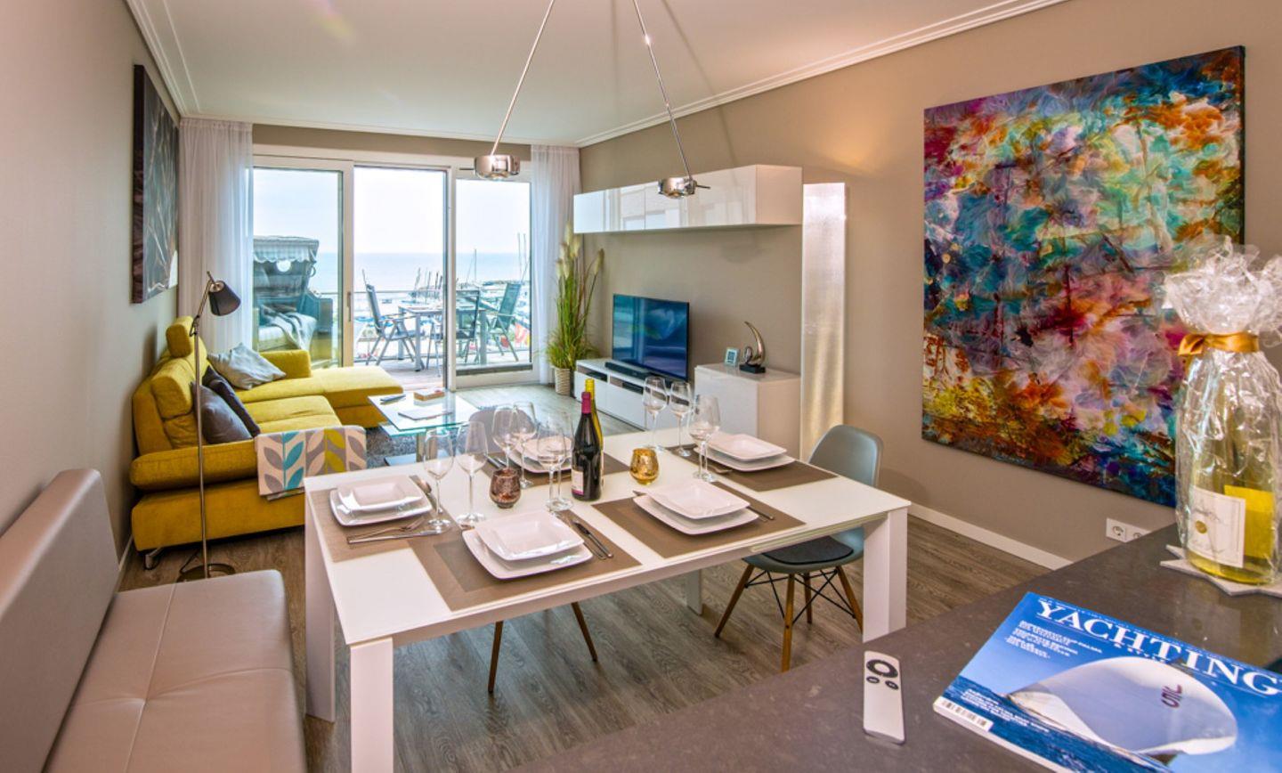 Moderne und stilvolle 3-Zimmer-Wohnung für 5 Personen mit 100 % Seeblick, direkt am Strand und fantastischem Blick in den Yachthafen Grömitz.