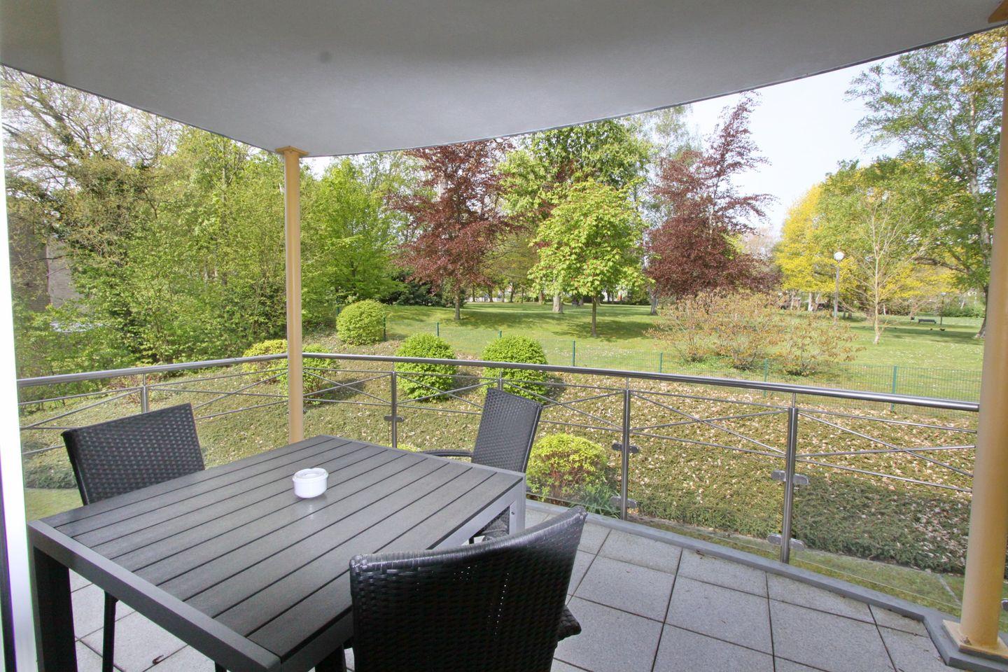 Der große Balkon mit Blick in der Kurpark lädt zum Verweilen ein.
