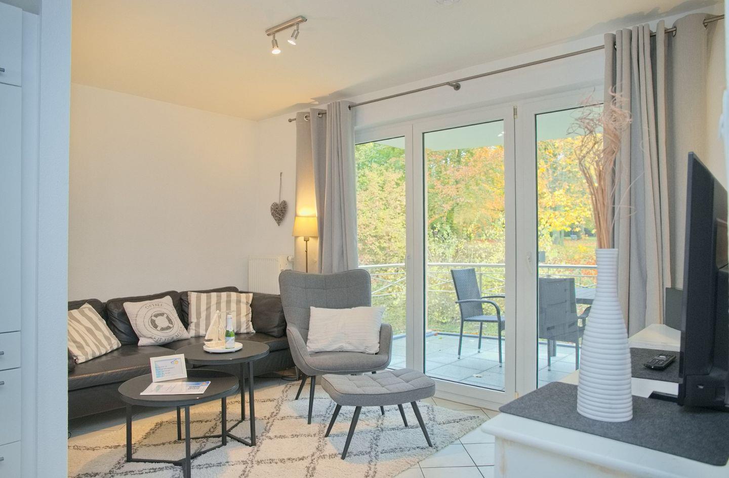 Moderne 2-Zimmer-Ferienwohnung in Grömitz mit Balkon und Blick auf den Kurpark, WLAN inklusive.