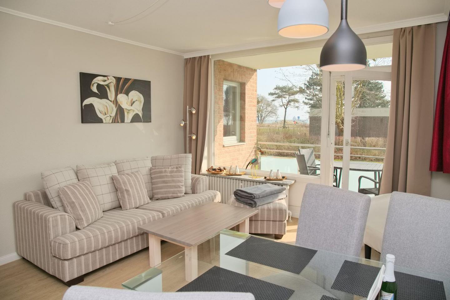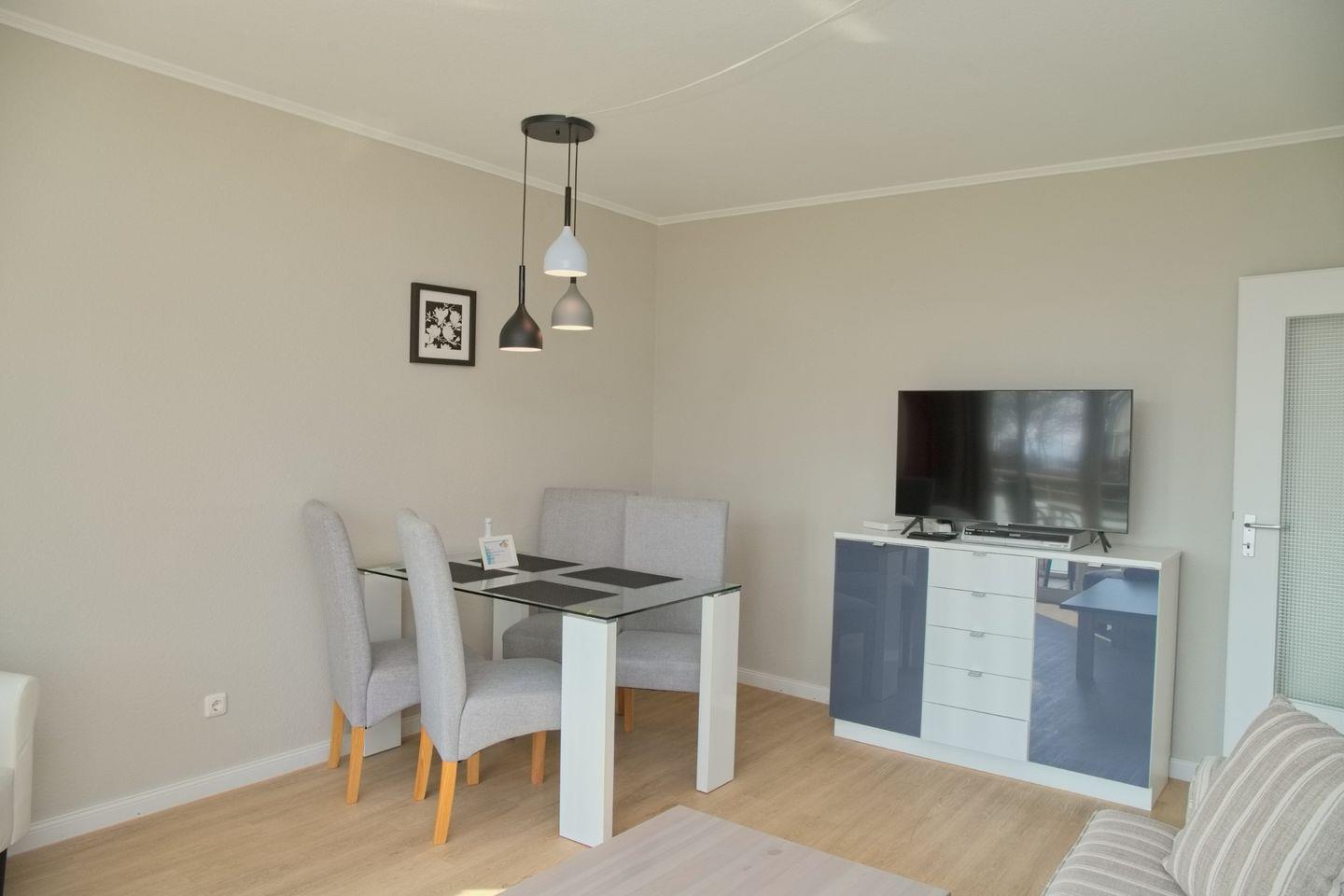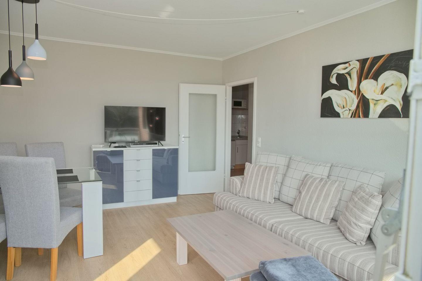 Hier erwartet Sie eine schlichte, aber geschmackvolle Einrichtung. Im modern gestalteten Wohnzimmer finden Sie einen gemütlichen 3- Sitzer mit Fußhocker und einen Flachbild-TV zur Unterhaltung. Die Essgruppe für 4 Personen lädt zu gemeinsamen Mahlzeiten und gemütlichen Stunden ein, perfekt für ein ausgiebiges Frühstück mit Ihrer Familie.