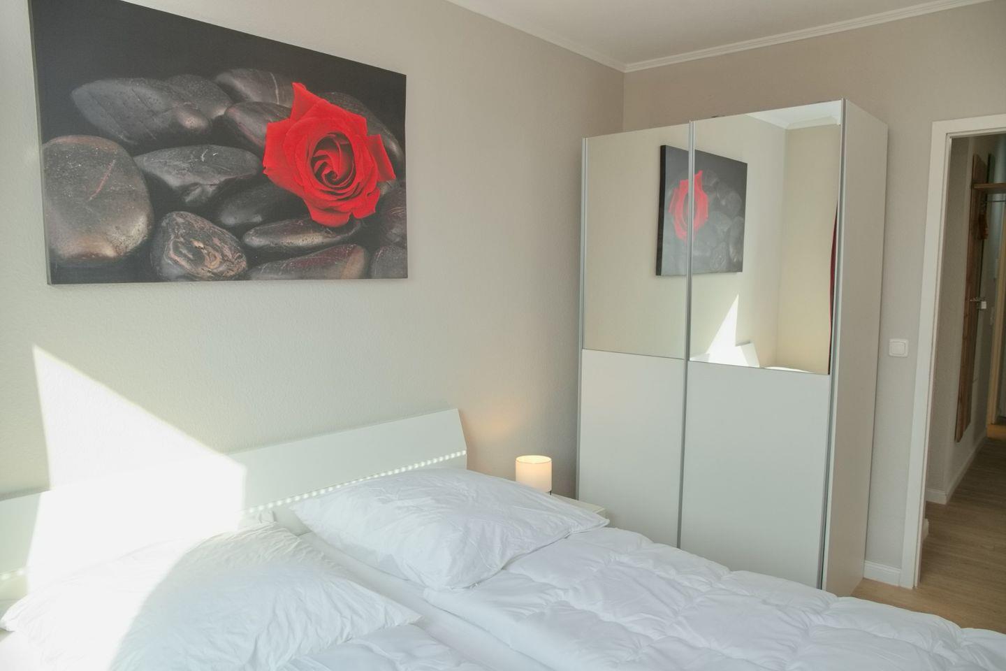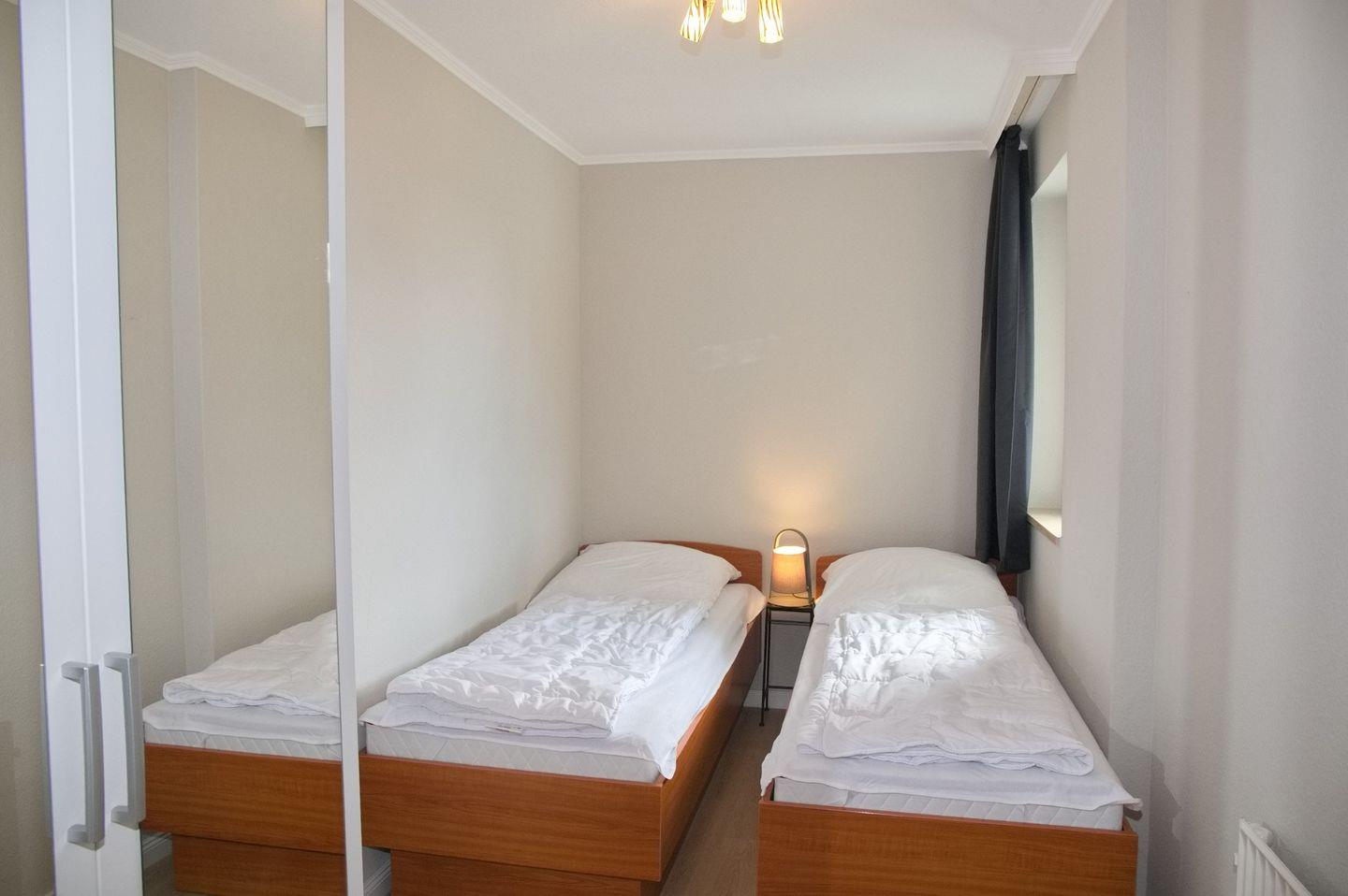 Im Schlafzimmer erwartet Sie ein großes Doppelbett und ein geräumiger Spiegelschrank. Leider ist das Zustellen eines Babybettes nicht möglich. Im zweiten Schlafraum stehen zwei Einzelbetten und ein weiterer Spiegelschrank zur Verfügung.