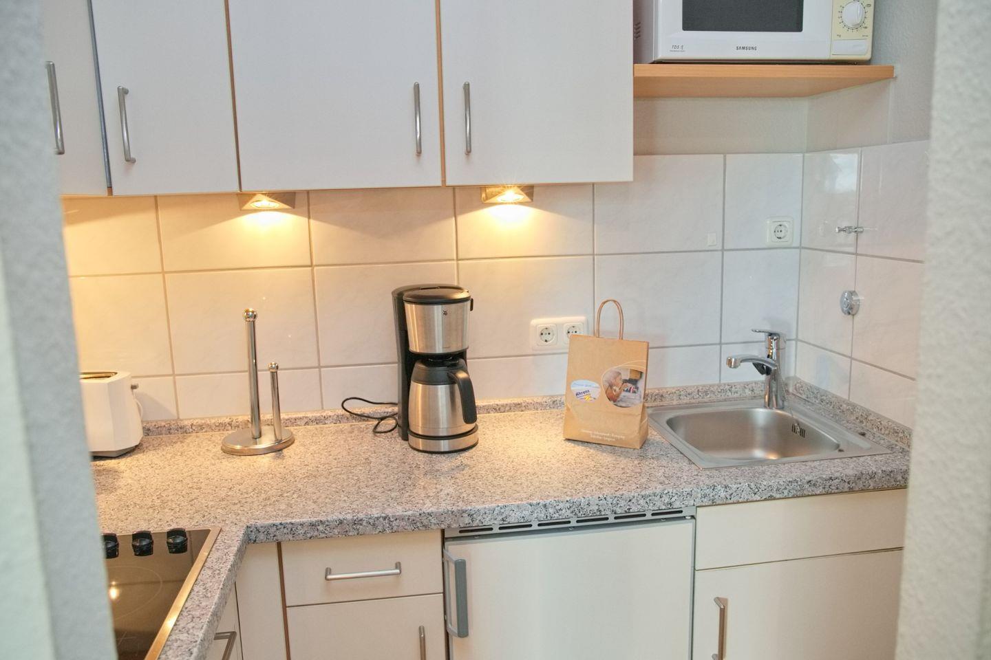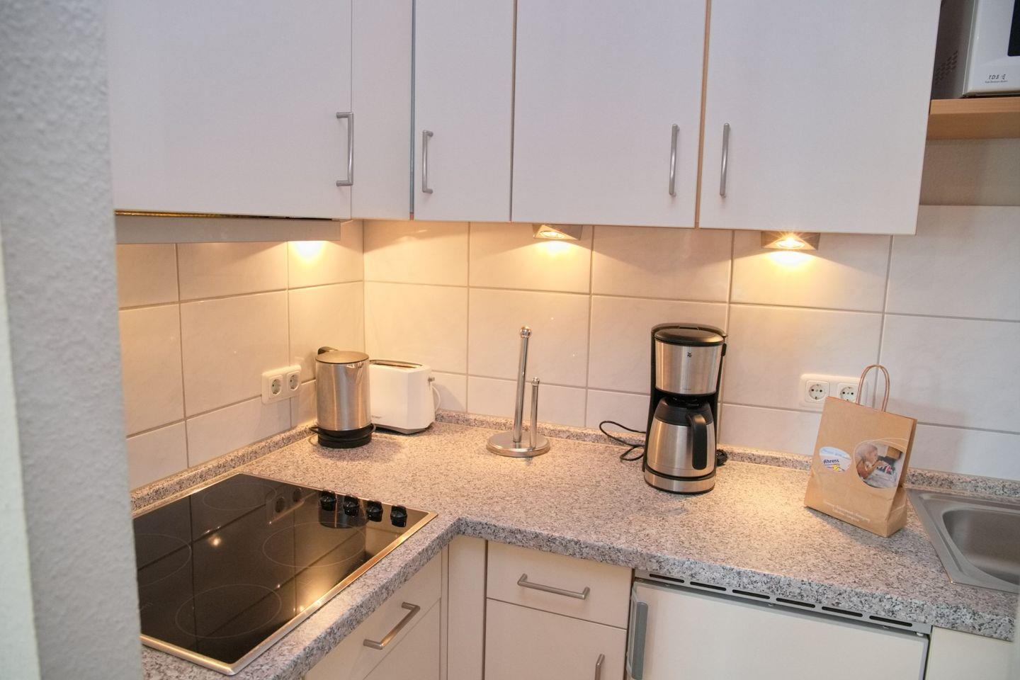 Die Küche ist gut ausgestattet mit Cerankochfeld, Kühlschrank mit Gefrierfach, Kaffeemaschine, Wasserkocher, Toaster und Mikrowelle – alles, was Sie für die Zubereitung Ihrer Lieblingsgerichte benötigen.