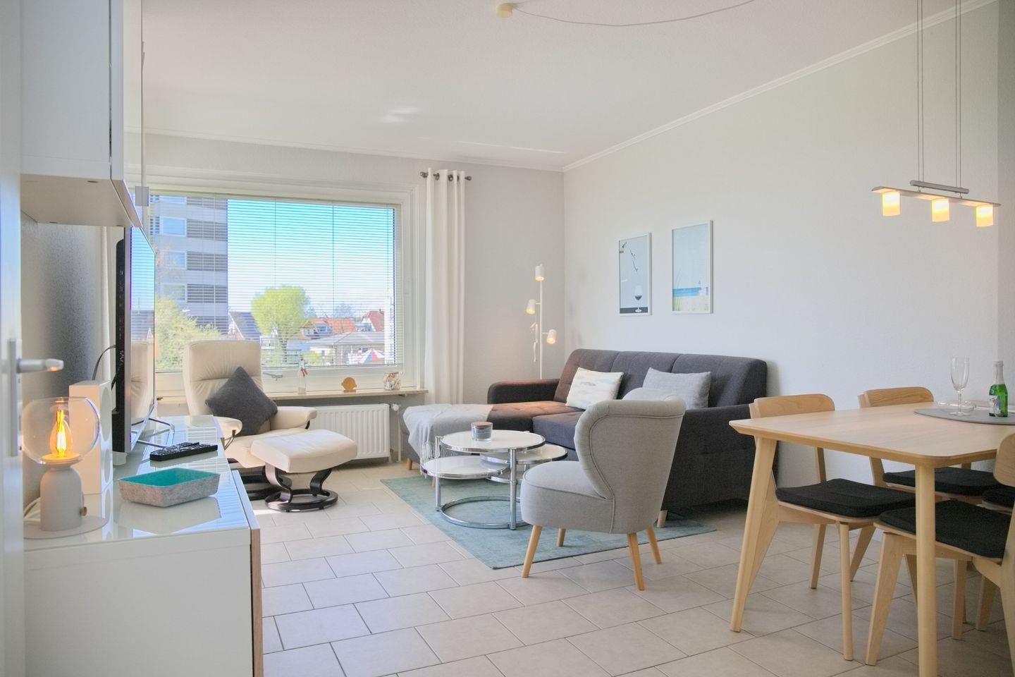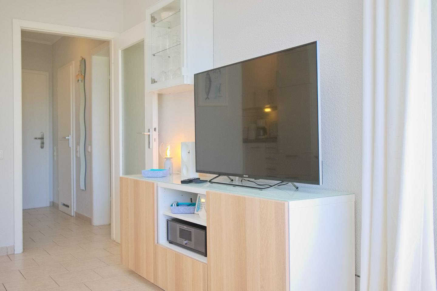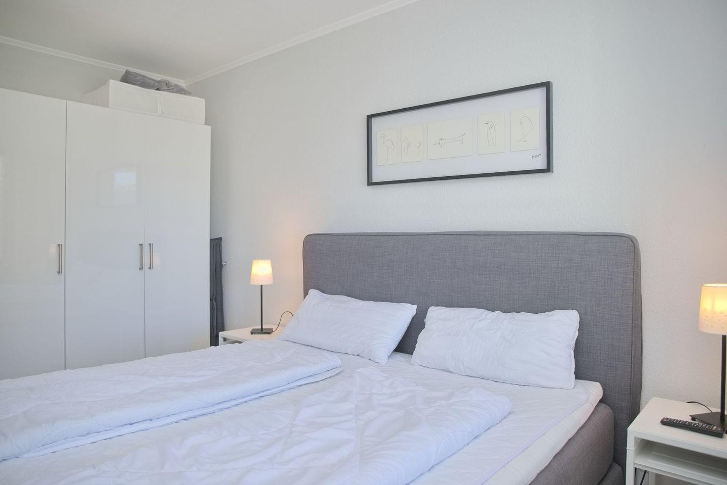 Sehr schöne 2-Zimmer-Wohnung (ca. 43 qm) für 4 Personen in der 2. Etage mit möblierten Balkon und Seeblick in Westlage. Das Wohnzimmer ist mit einem Sofa mit Schlaffunktion (Liegefläche 120 x 200 cm), einem Stressless Sessel mit Hocker, einen Flach-TV, einer Stereoanlage sowie einem Essbereich mit 4 Stühlen ausgestattet. Die offene Einbauküche verfügt über einen Geschirrspüler, einem Cerankochfeld, einem Backofen, einer Heißluftfritteuse, ein Kühlschrank mit Gefrierfach, eine Kaffeemaschine, einer Nespresso Kapselmaschine, einem Toaster und Wasserkocher. Im Schlafzimmer stehen ein Doppelboxspringbett (durchgehender Topper, 180x200 cm), ein Flach-TV und ein Kleiderschrank zur Verfügung. Freundliches helles Duschbad mit Rainshower, WC, Waschtisch und Fön.