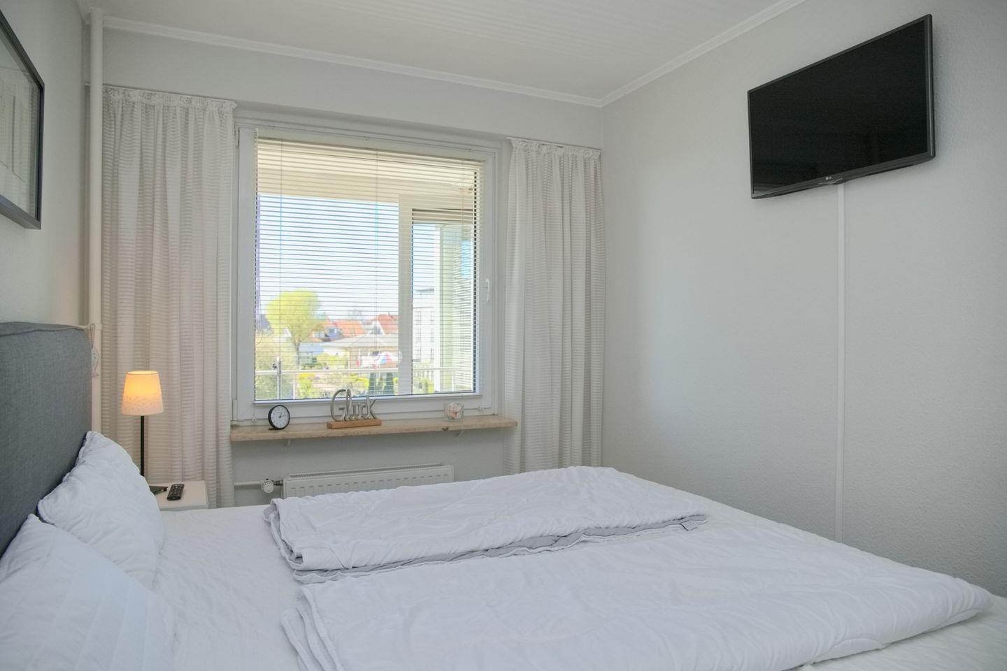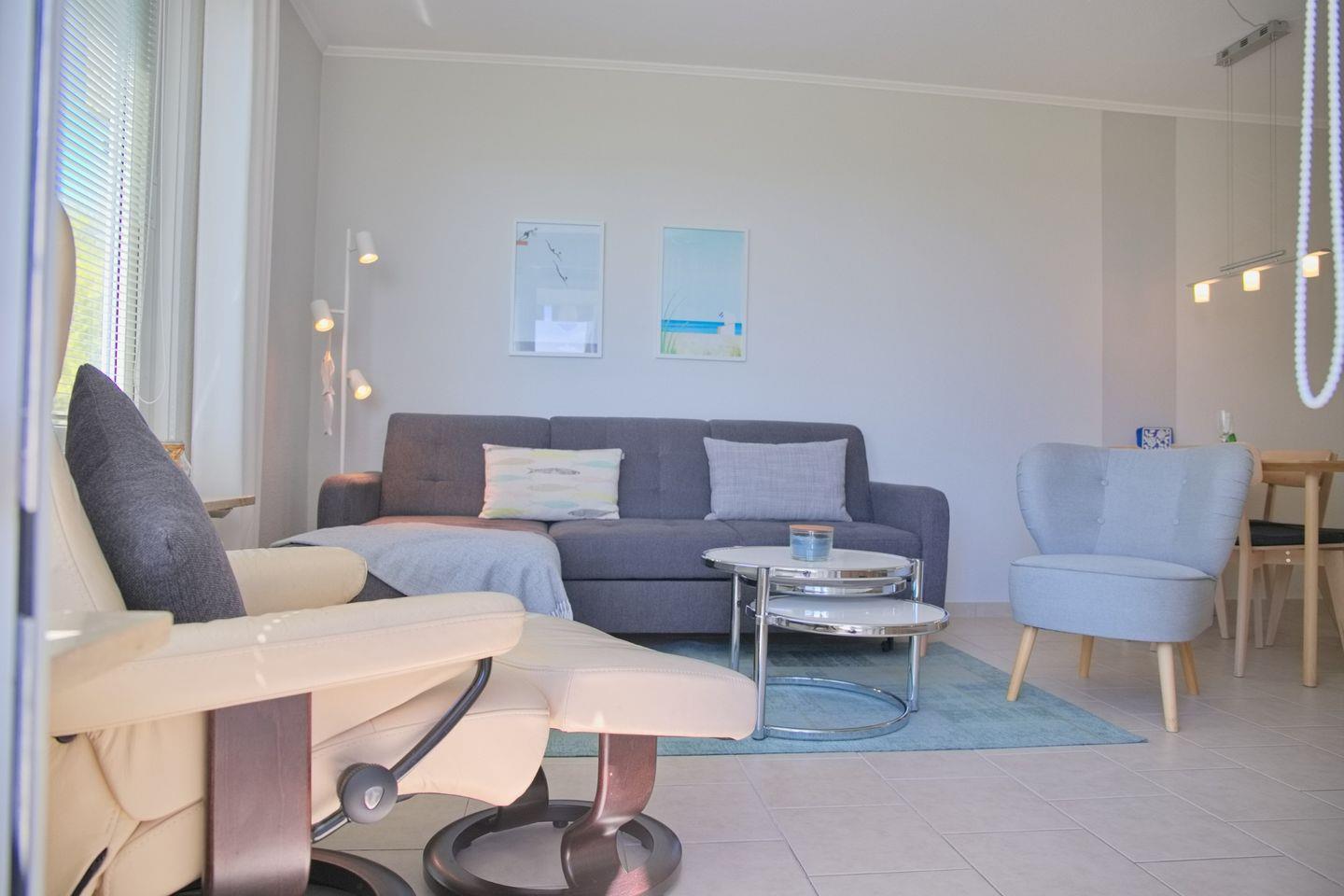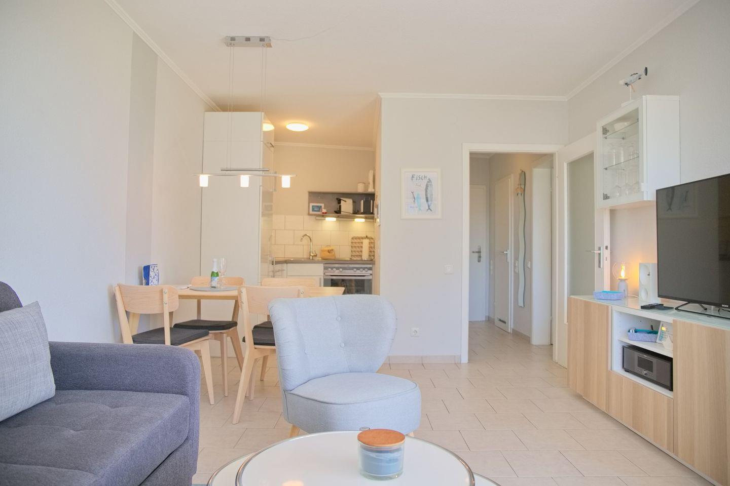Sehr schöne 2-Zimmer-Wohnung (ca. 43 qm) für 4 Personen in der 2. Etage mit möblierten Balkon und Seeblick in Westlage. Das Wohnzimmer ist mit einem Sofa mit Schlaffunktion (Liegefläche 120 x 200 cm), einem Stressless Sessel mit Hocker, einen Flach-TV, einer Stereoanlage sowie einem Essbereich mit 4 Stühlen ausgestattet. Die offene Einbauküche verfügt über einen Geschirrspüler, einem Cerankochfeld, einem Backofen, einer Heißluftfritteuse, ein Kühlschrank mit Gefrierfach, eine Kaffeemaschine, einer Nespresso Kapselmaschine, einem Toaster und Wasserkocher. Im Schlafzimmer stehen ein Doppelboxspringbett (durchgehender Topper, 180x200 cm), ein Flach-TV und ein Kleiderschrank zur Verfügung. Freundliches helles Duschbad mit Rainshower, WC, Waschtisch und Fön.