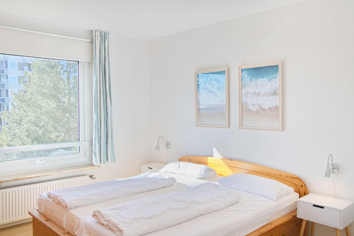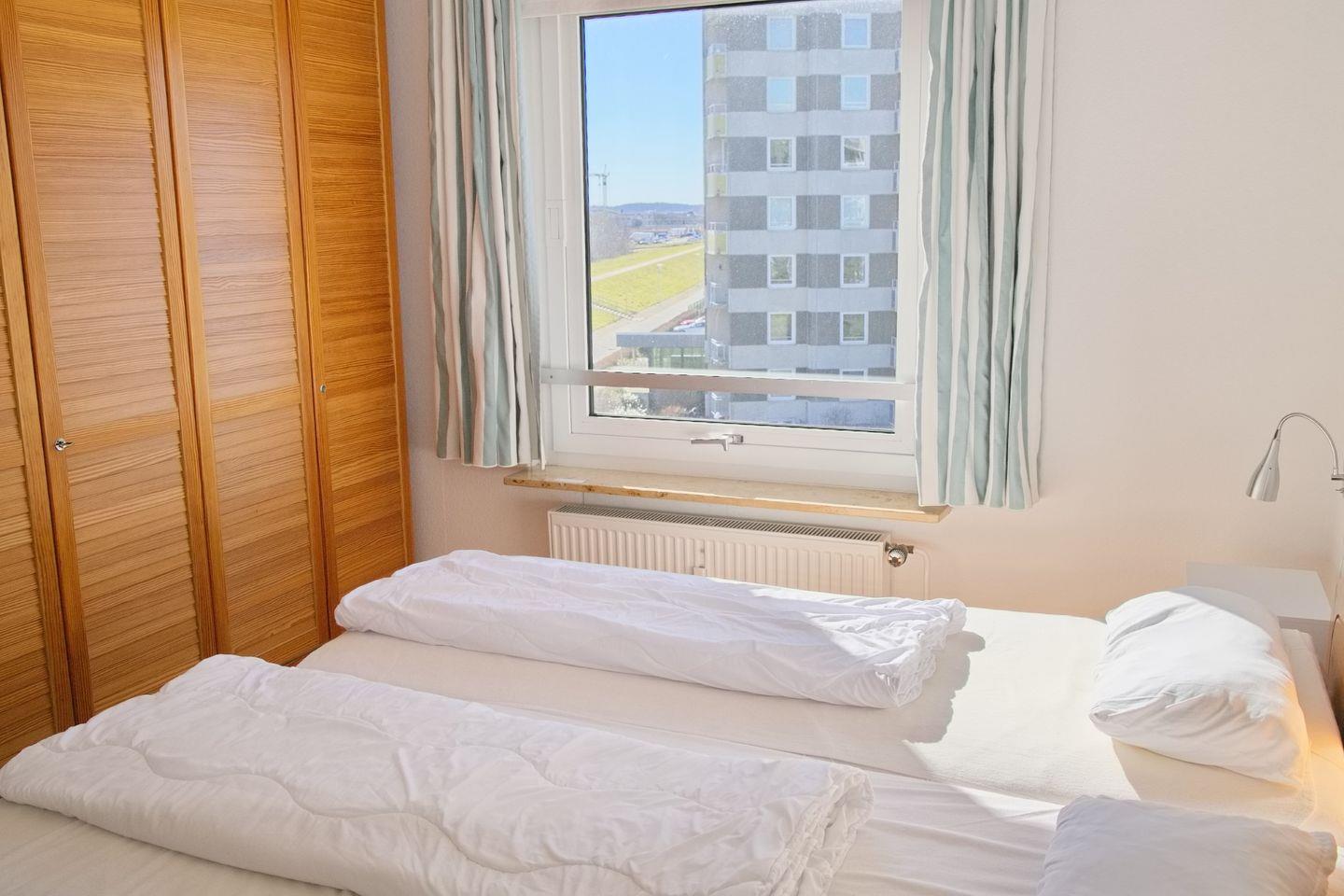 Zurück auf den Flur geht es weiter in das separate Schlafzimmer mit Doppelbett (x 90 x200 cm) und Kleiderschrank. Ein Kinderreisebettchen ist hier zustellbar. Verdunklungsmöglichkeiten in Form von Vorhängen sind vorhanden.