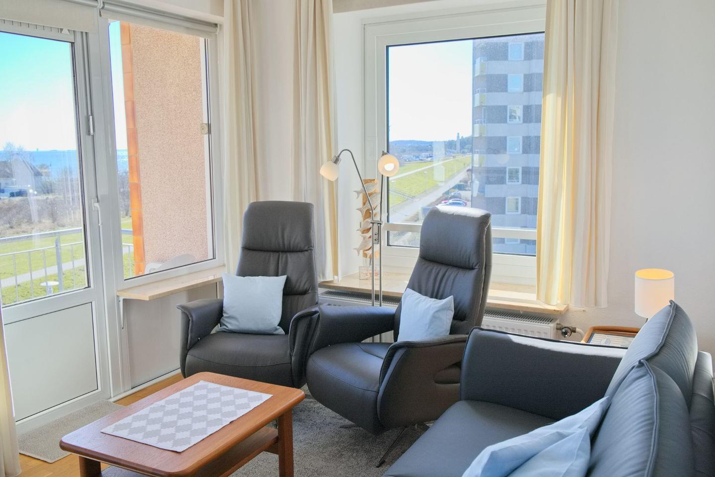 Gemütliche Ferienwohnung mit möbliertem Südbalkon und Panoramablick über die Lübecker Bucht in Grömitz.