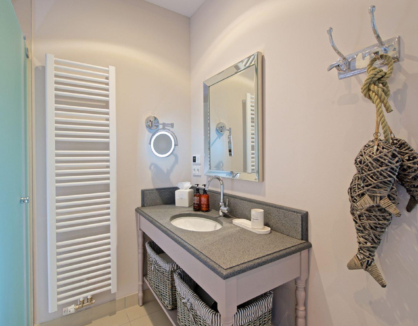 Im Schlafzimmer mit einem schönen Meerblick finden Sie ein Boxspringbett ( 200 x 200 cm mit durchgehendem Topper), LED-Leseleuchten, einen Flach-TV und einen großen Einbauschrank. Im Duschbad können Sie sich unter einer Schwalldusche erfrischen, Sie finden außerdem einen beleuchteten Schminkspiegel, einen Fön und ein Radio. Das WC ist separat gehalten.