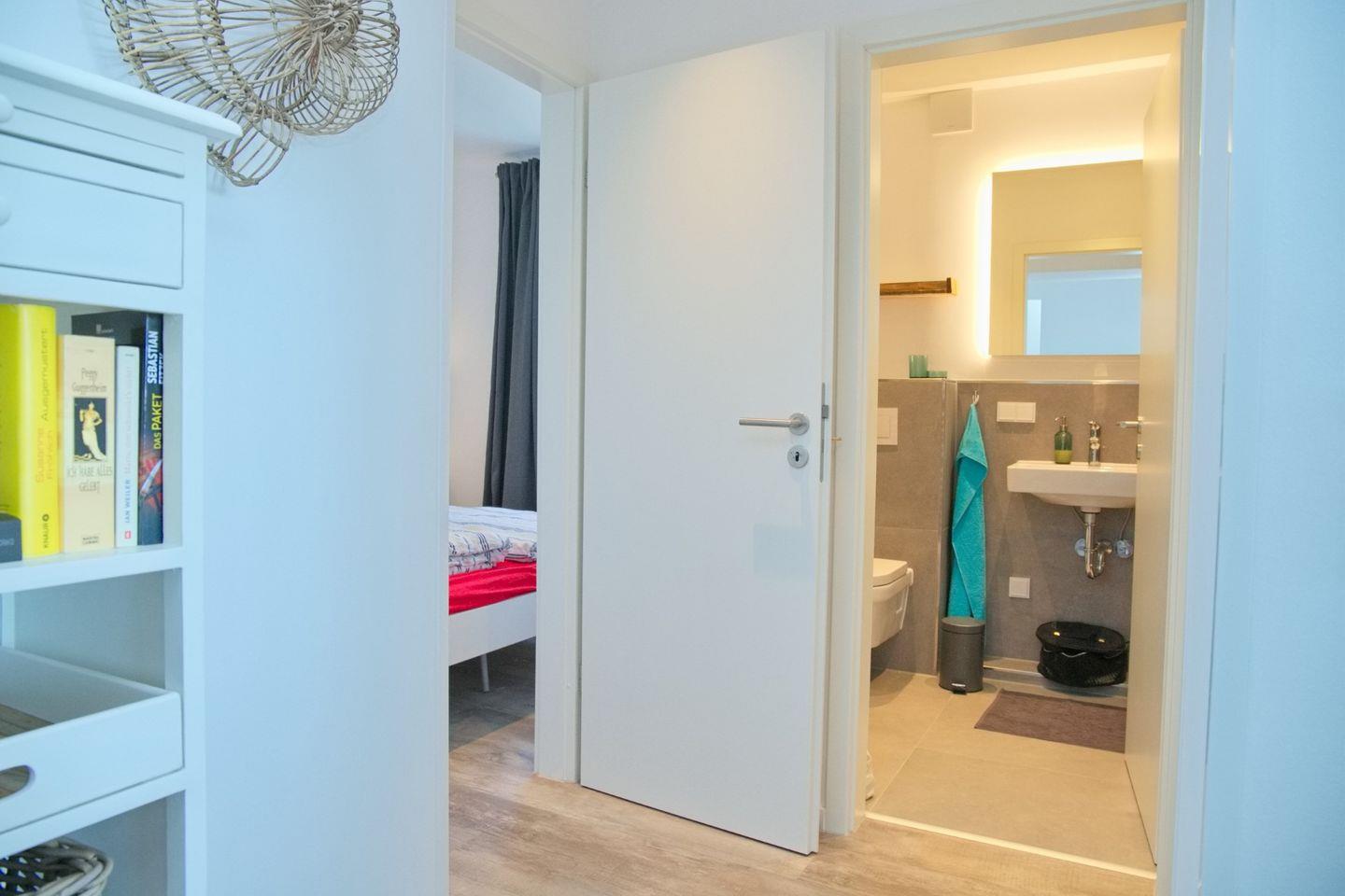 Das Badezimmer ist modern und elegant gestaltet. Es verfügt über eine ebenerdige Dusche, hochwertige Armaturen und stilvolle Fliesen. Hier kannst du dich nach einem Tag am Strand entspannen und erfrischen.