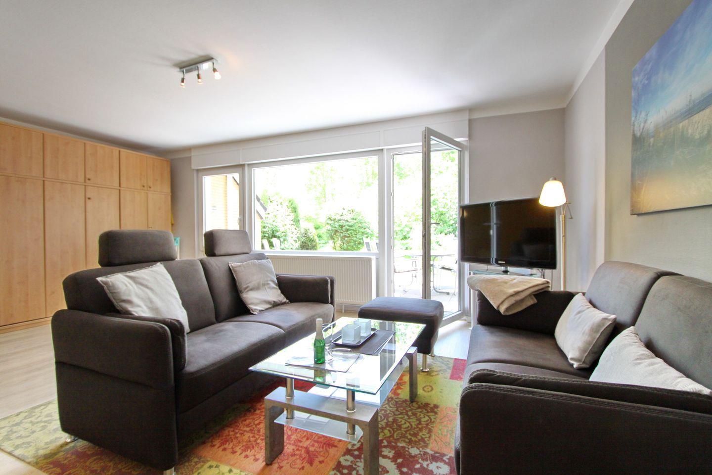 Die Sitzgarnitur im Wohnzimmer bietet viel Platz für gemütliche Familienabende. Zur Unterhaltung steht ein Flach-TV bereit.