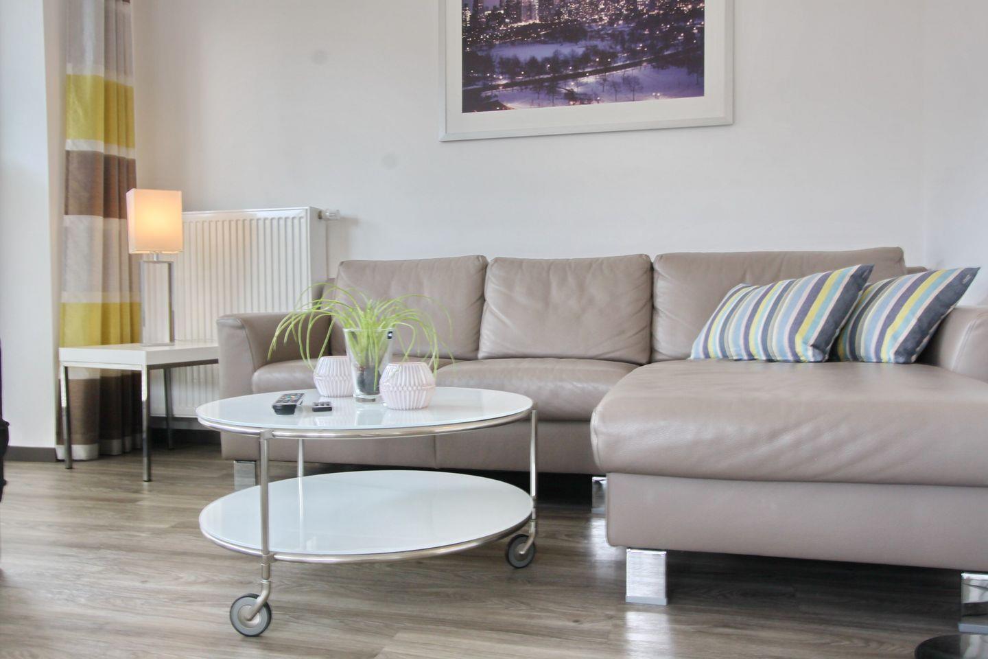 Das geräumige und moderne Wohnzimmer ist mit einer gemütlichen Eckcouch, einen bequemen Sessel, einen TV, ein Radio mit CD und einem Essbereich für 4 Personen ausgestattet.