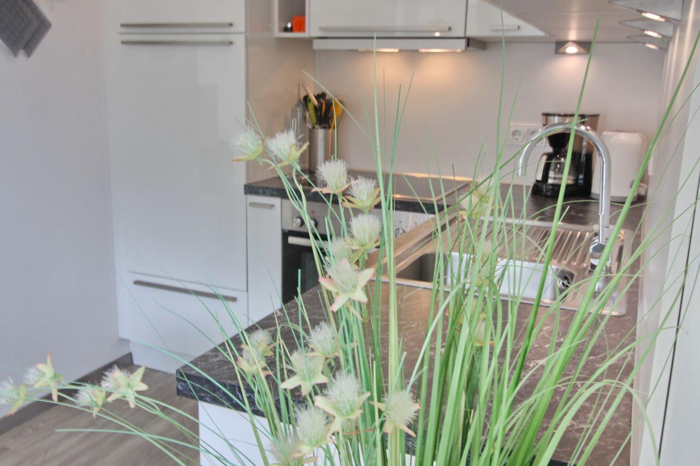 Die stilvolle Einbauküche verfügt über ein Ceranfeld, einen Backofen, eine Mikrowelle, einen Geschirrspüler, einen Kühlschrank mit Gefrierfach, einer Kaffeemaschine, einem Wasserkocher und einem Toaster.