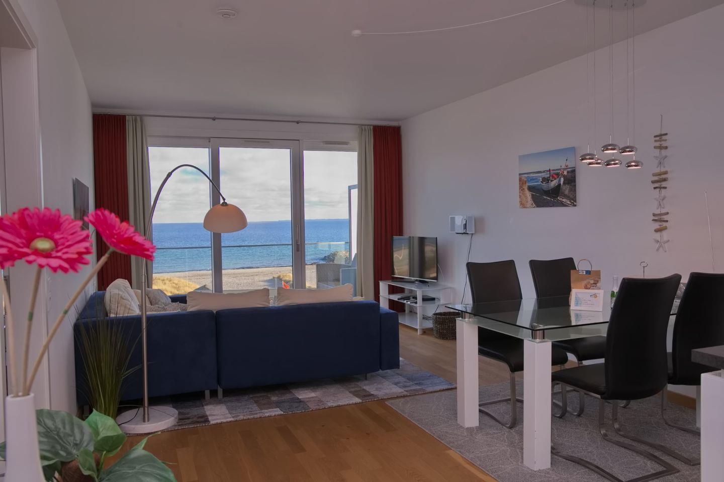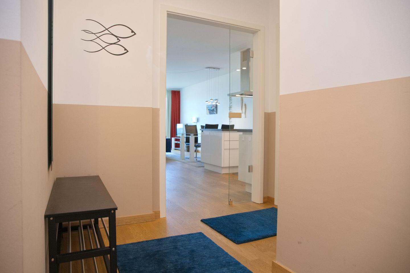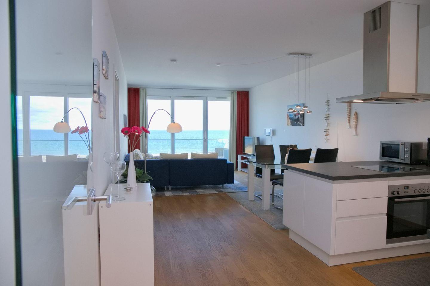 Die Wohnfläche der ca. 80m² großen 2 Zimmer Ferienwohnung liegt in der 1. Etage einer gepflegten Wohnanlage in erster Reihe, direkt an der Promenade und dem Yachthafen.