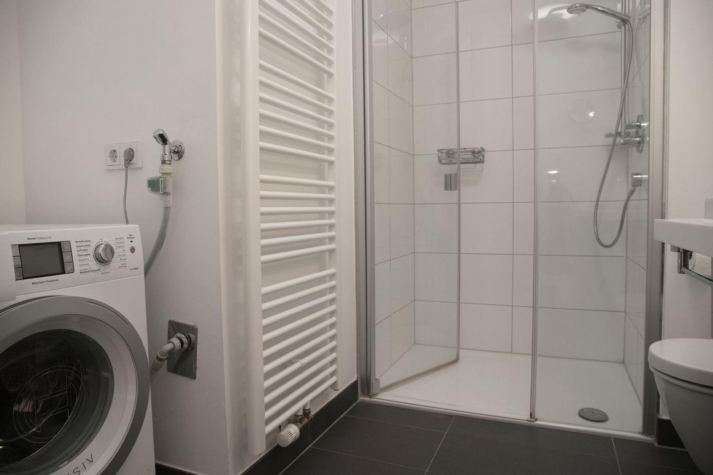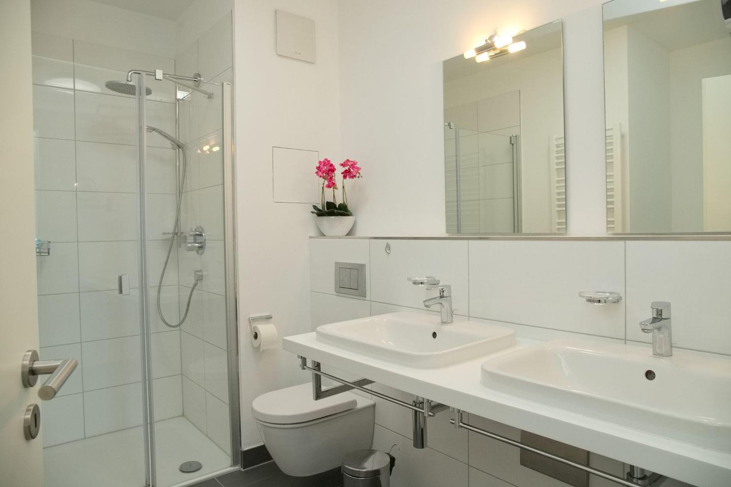 Direkt angrenzend an das Schlafzimmer kommen Sie über einen kleinen Vorraum ins große Duschbad. Im Vorraum finden Sie einen Kleiderschrank, ein Kinderreisebett findet hier bei bedarf Platz.
