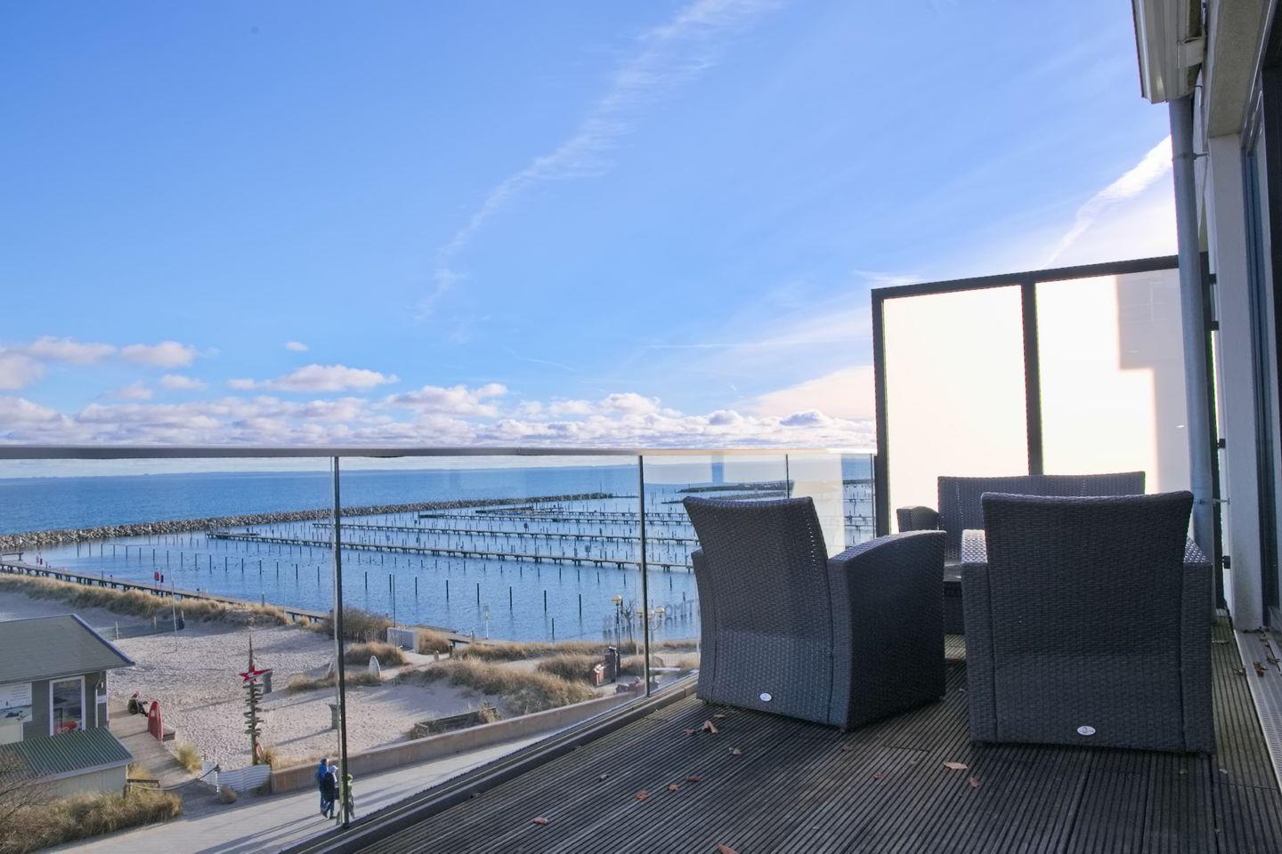 Auf dem großen möblierten Balkon mit Markise können Sie in der Sonne den Panoramablick über die Lübecker Bucht genießen.