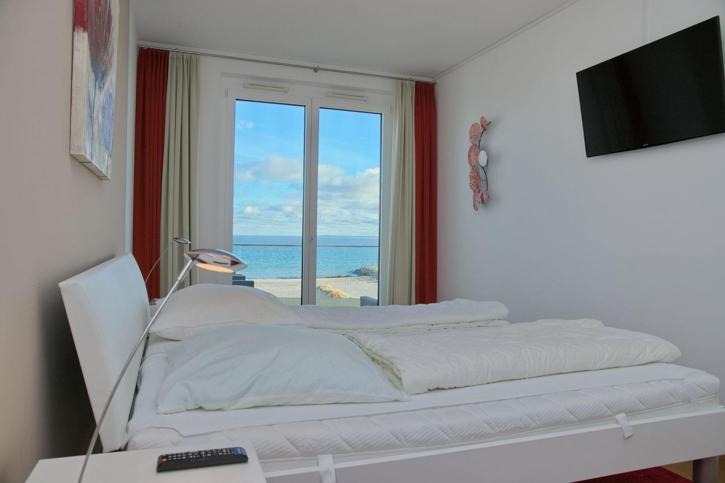 Vom Wohnbereich kommen Sie in das Schlafzimmer mit Flach TV, großer Fensterfront, Seeblick und Doppelbett.