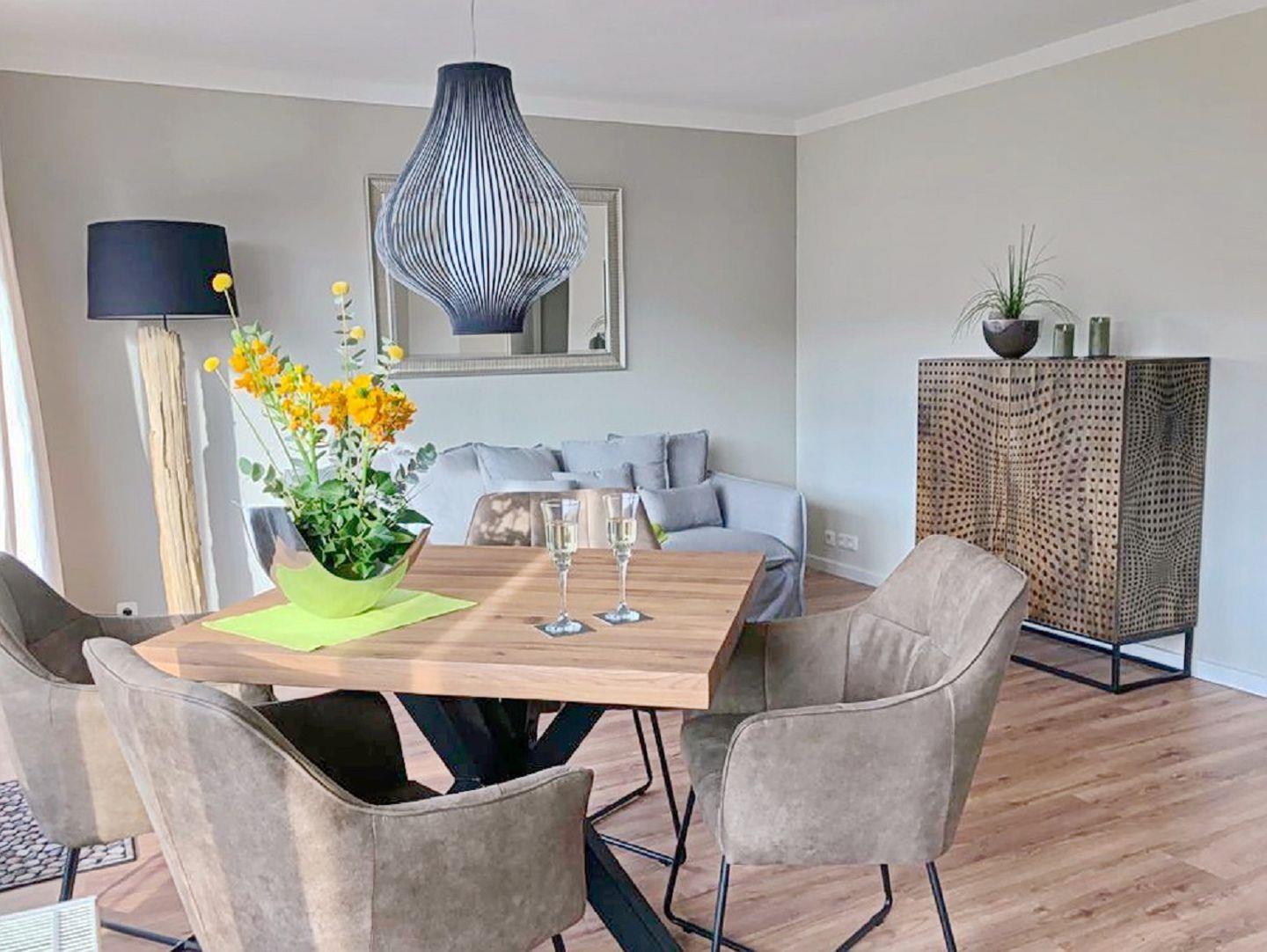Die Wohnung ist ausgestattet für zwei Erwachsene und verfügt über einen komplett ausgelegten Vinylfußboden in Eiche-Natur-Optik, der Wohn-/Essbereich ist ausgestattet mit einem Esstisch in Natureiche mit 4 Stühlen, gemütlichem Hussensofa, sowie einem High- und Lowboard. Fürs Entertainment sorgt ein 50“ Smart-Flach-TV mit Soundbar und eine moderne Musikanlage (Bluetoothfähig).