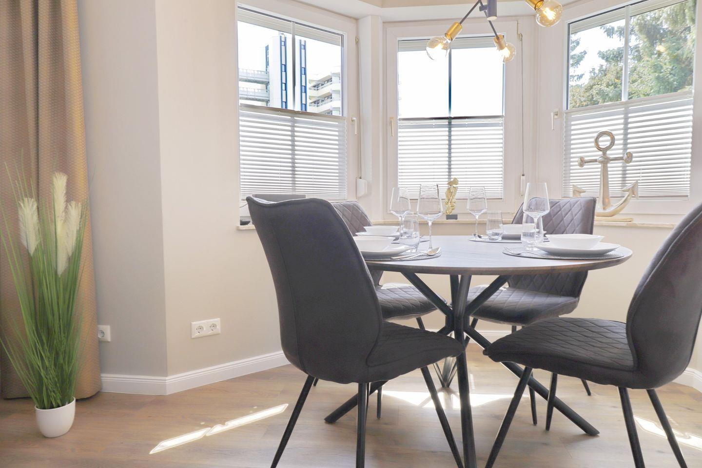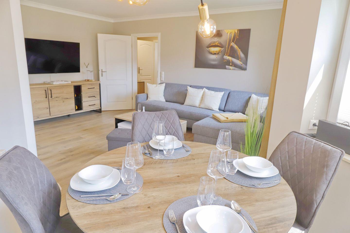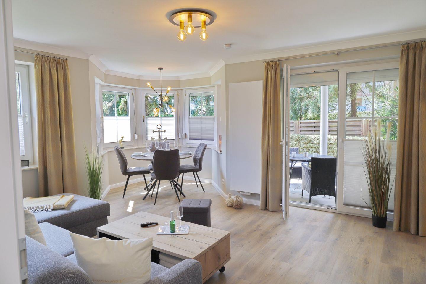 Ein moderner Ferientraum in Grömitz erwartet Sie mit diesem Appartement. Der liebevoll eingerichtete Wohnbereich bietet Ihnen eine moderne Eckcouch mit Schlaffunktion und extra Matratze mit einer Liegefläche von 160 x 195 cm und Flatscreen-TV. Der Essbereich ist harmonisch in das gesamt Konzept integriert und findet seinen Platz im Erker des Wohnzimmers. Die helle, toll ausgestattete Einbauküche gibt Ihnen alle Möglichkeiten, sich im Urlaub kulinarisch zu verwöhnen. Vom Wohnbereich aus erreichen Sie Ihre Terrasse, die im Sommer möbliert ist.