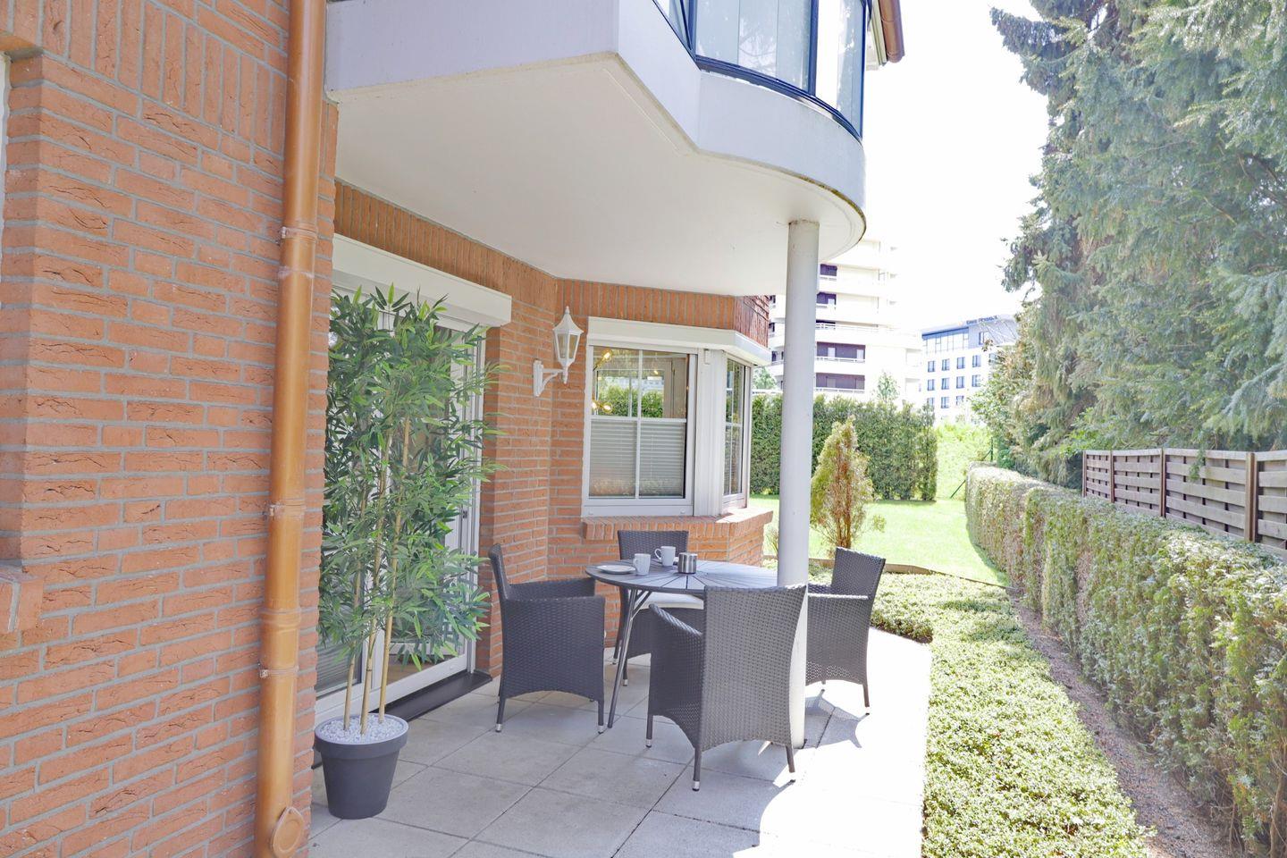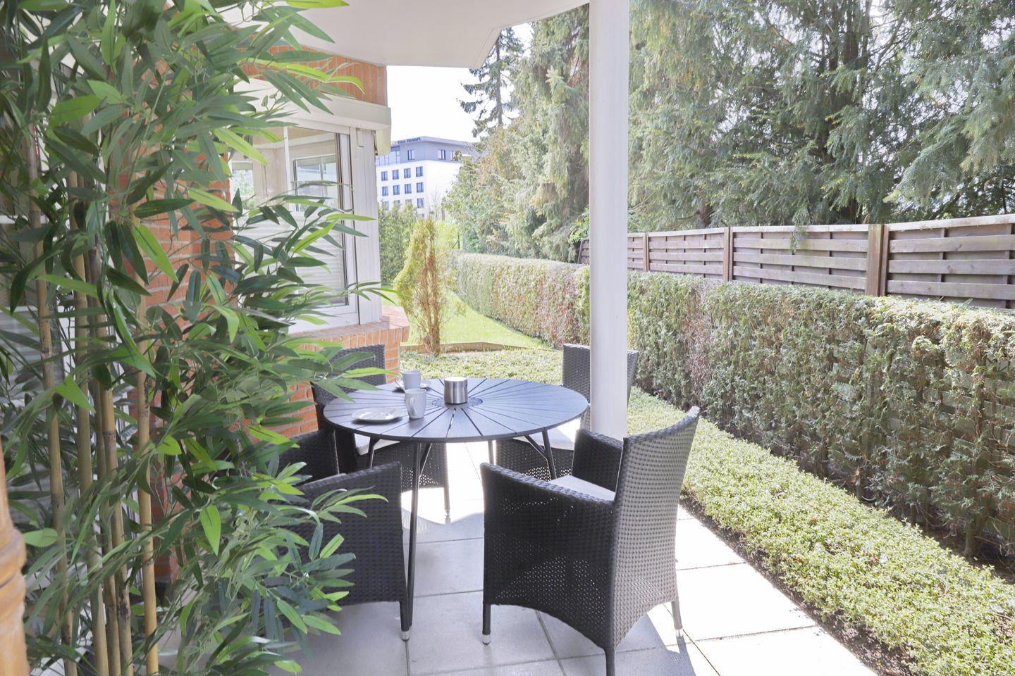 Noch grüner wird es auf der hübschen Gartenterrasse, auf der Sie an sonnigen Tagen den Tag beginnen oder