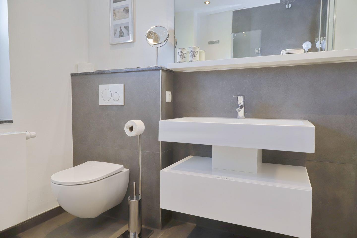 Das komplett sanierte und modernisierte Badezimmer rundet das Angebot ab. Hochwertige Sanitärobjekte und Einbauten namhafter Hersteller. Lassen Sie sich von der bodentiefe Rain-Dusche verwöhnen und starten Sie entspannt in den Tag.