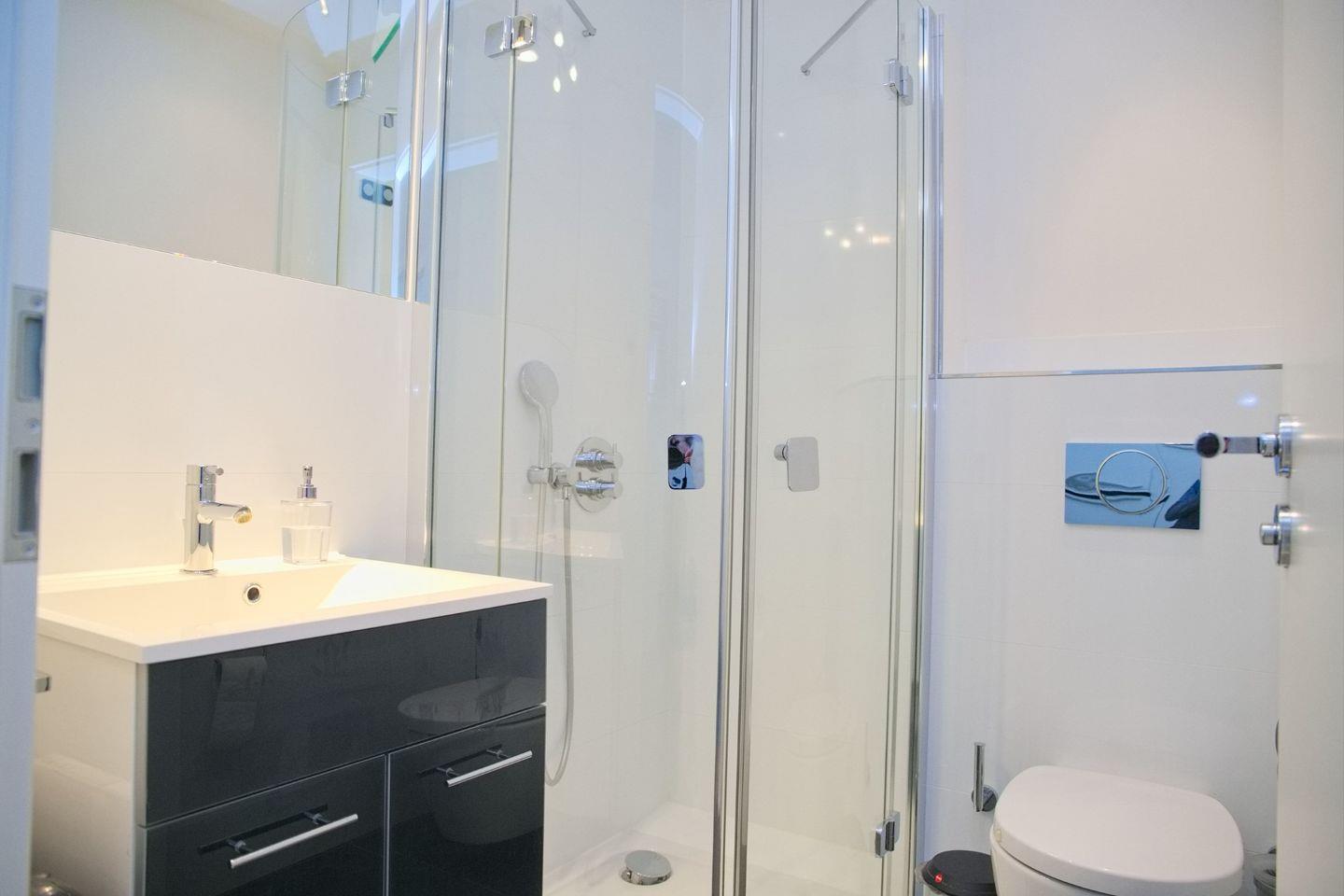 Zweites Duschbad: Das zweite Badezimmer bietet ebenfalls Duschmöglichkeiten mit Rainshower, WC, Waschtisch und Fön.