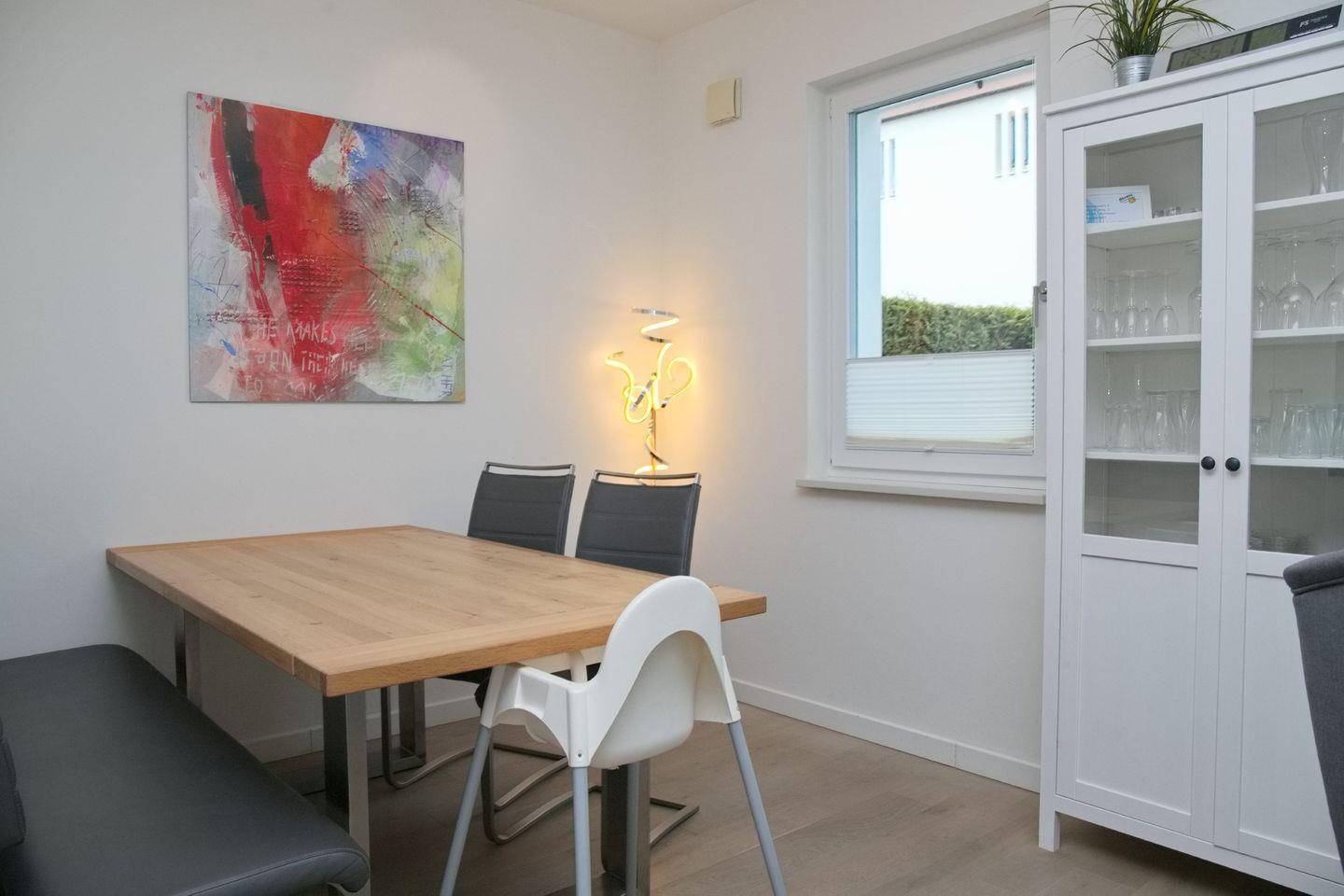 Essbereich: Der Essbereich im Wohnzimmer bietet Platz für gesellige Mahlzeiten. Eine Sitzbank, ein Tisch und zwei Stühle laden zum Verweilen ein.