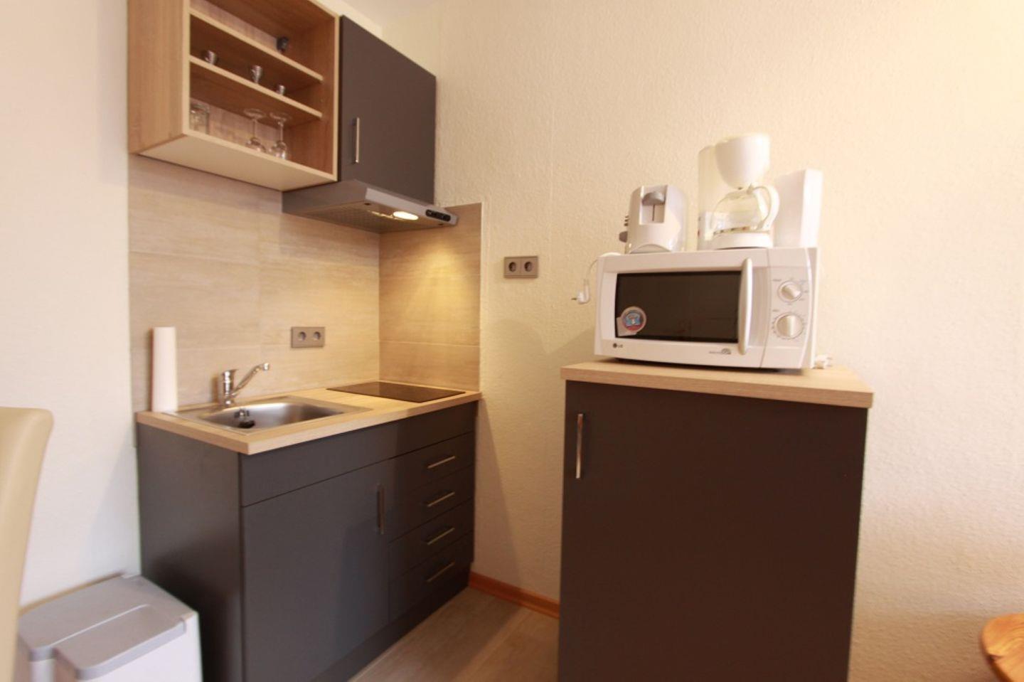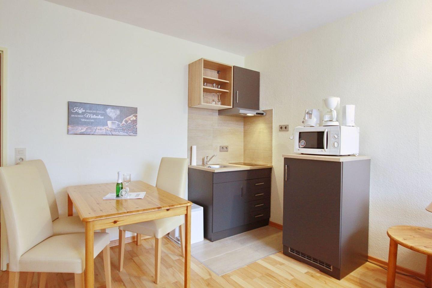 Die kleine Pantryküche bietet ein 2er Cerankochfeld, Kühlschrank mit Gefrierfach, Mikrowelle, Kaffeemaschine, Wasserkocher und Toaster.
