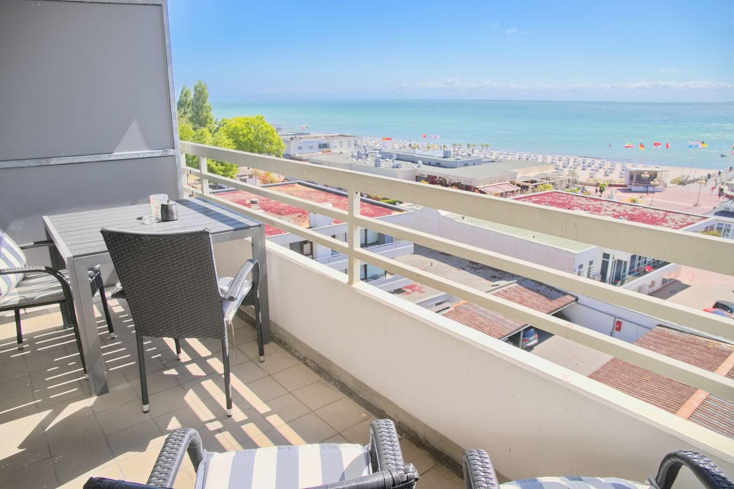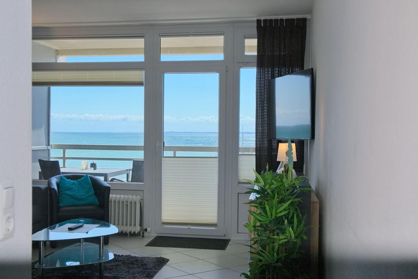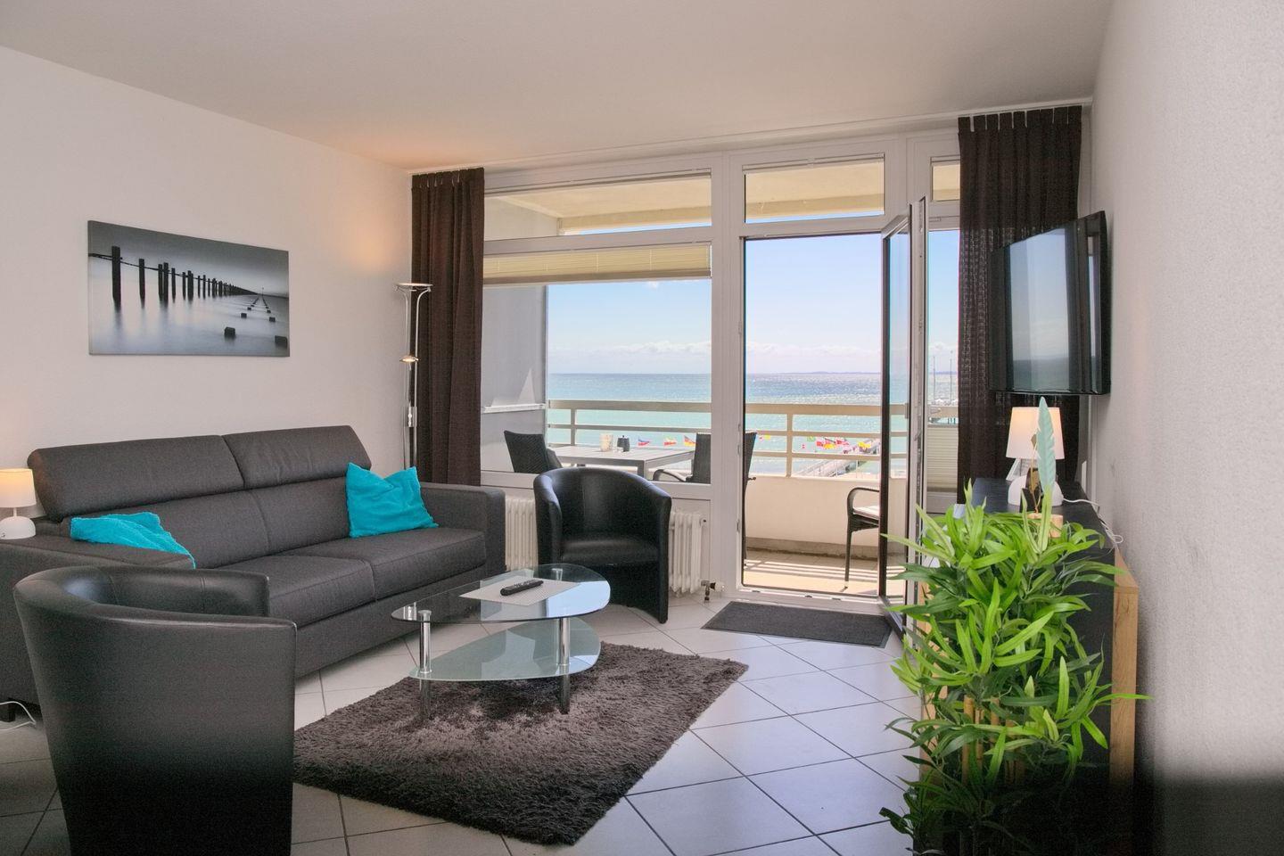 Moderne Ferienwohnung in Grömitz mit Südbalkon und direktem Ostseeblick, ideal für erholsamen Urlaub an der Promenade.