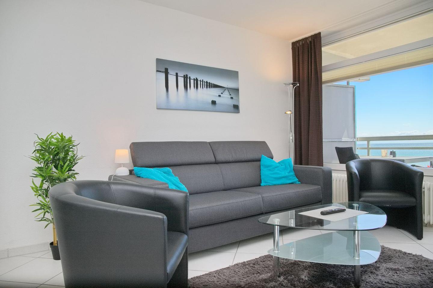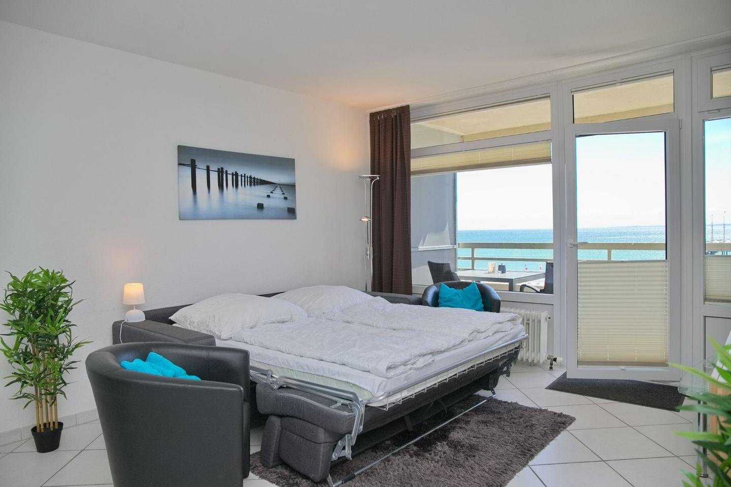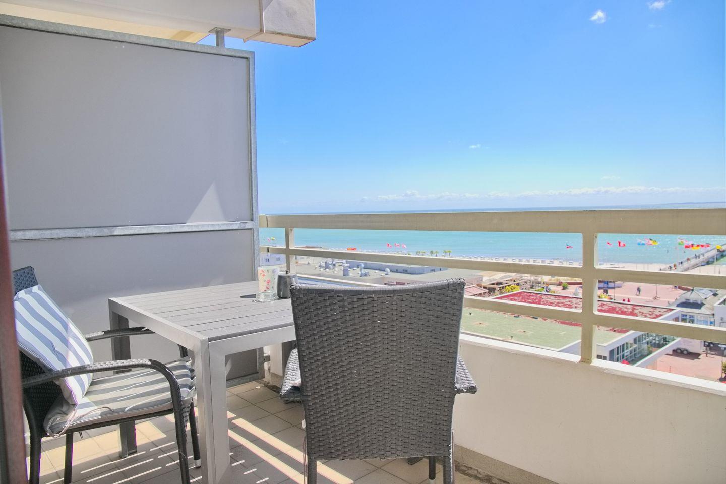 Moderne Ferienwohnung in Grömitz mit Südbalkon und direktem Ostseeblick, ideal für erholsamen Urlaub an der Promenade.