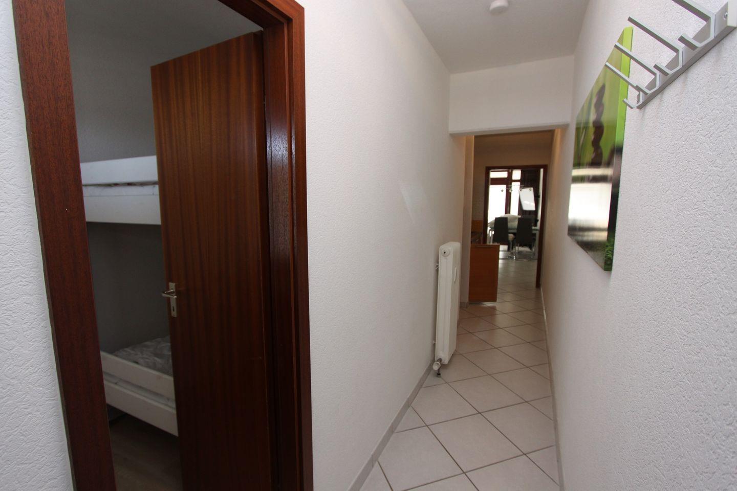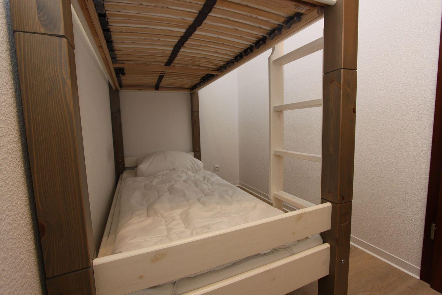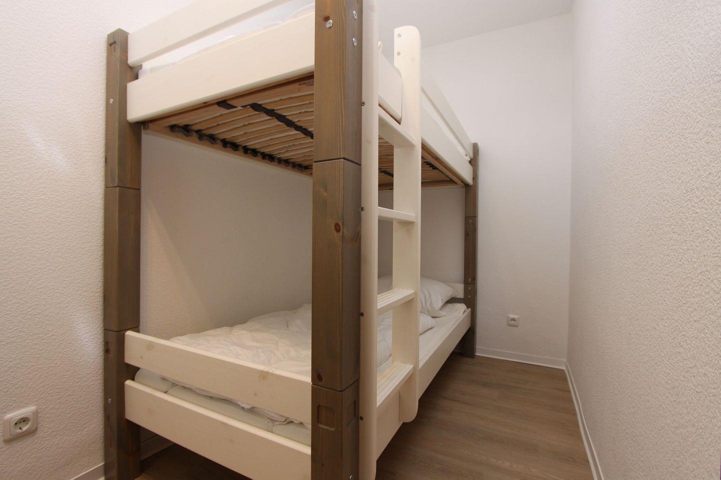 Im Kinderzimmer befindet sich ein praktisches Etagenbett und ein kleiner Schrank – optimal für den Urlaub mit Nachwuchs. Das moderne Badezimmer ist mit Dusche, WC und einem Spiegelschrank funktional und freundlich gestaltet.